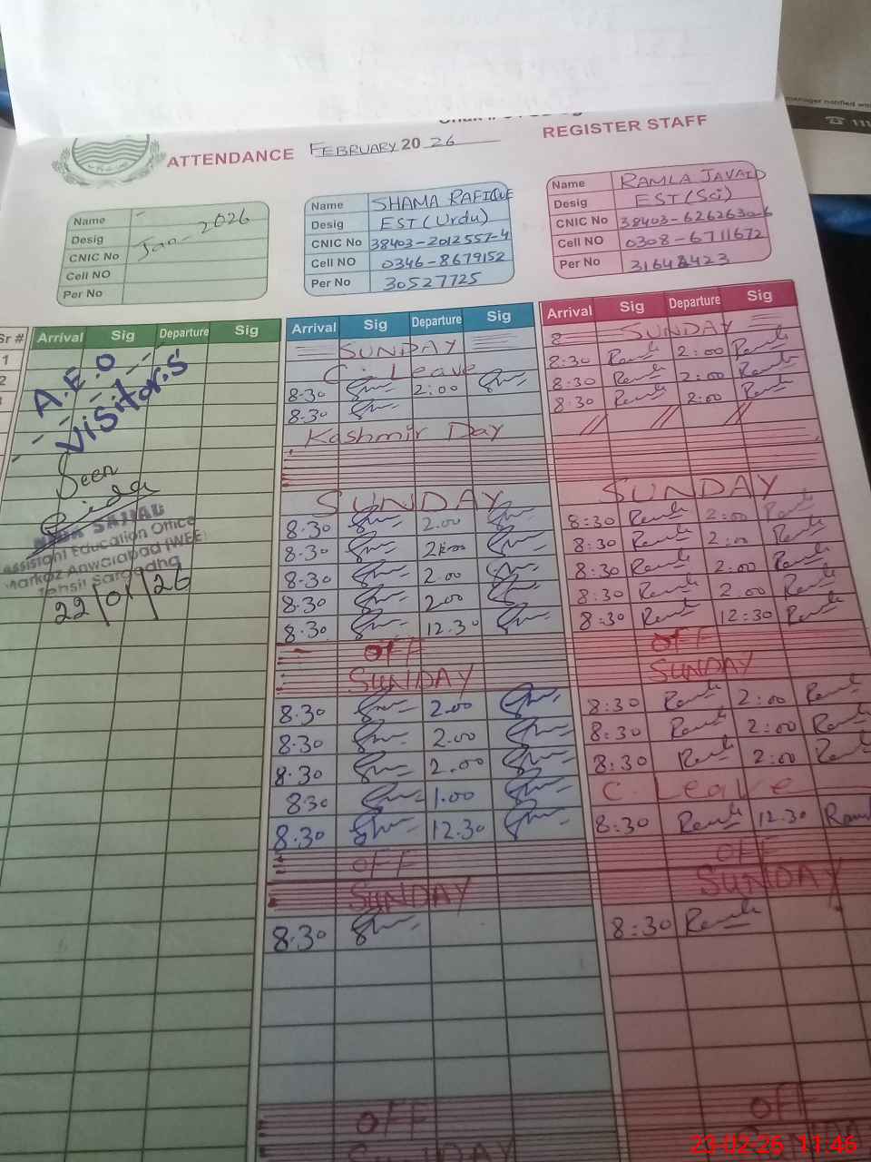 | CNIC | Full Name | Designation | R/C | Absence during last cal. month |
