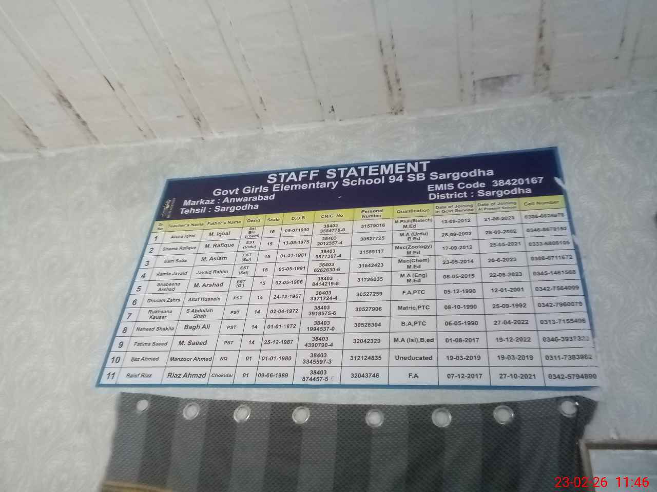 | Name: SH**** RA**** Designation: (School Headmaster's/Headmistress's) E.S.T.(Incharge) Phone/Cell Number: 03**** |