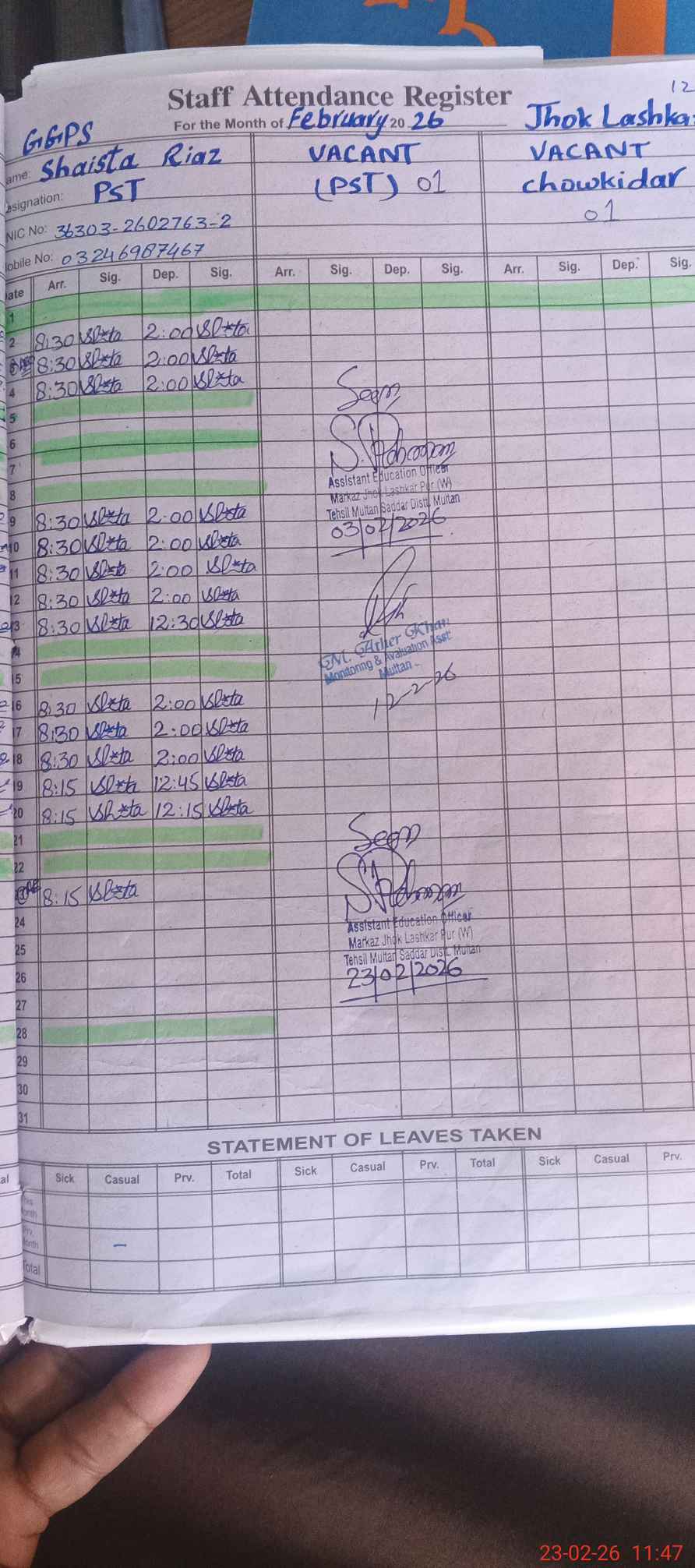 | Name: AB**** FR**** Designation: (School Headmaster's/Headmistress's) HEADMASTER Phone/Cell Number: 03**** |