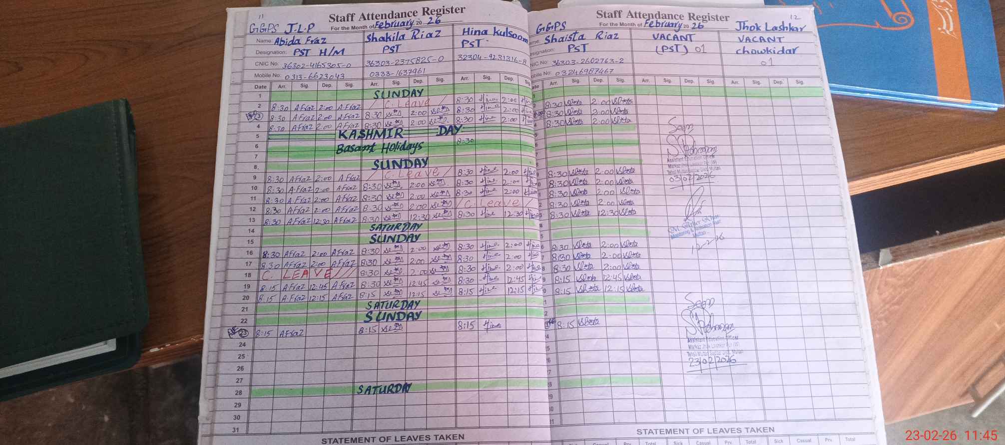 | CNIC | Full Name | Designation | R/C | Absence During Last Calender Month |