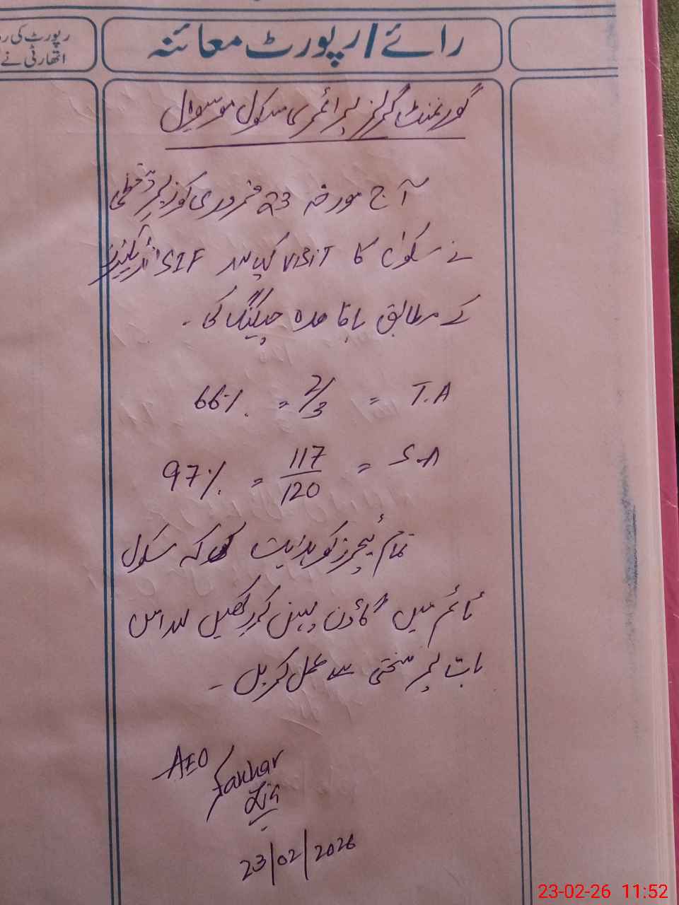 | Certified that this School was Inspected by the Undersigned MEA/DMO Today and the Information Stated Above is as Per Record. | |||||
