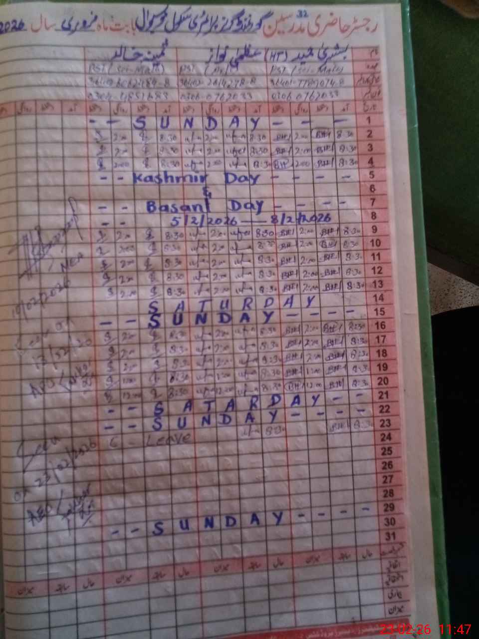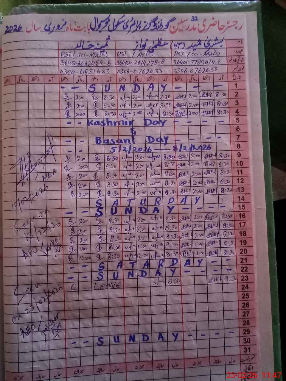 | Name: Uz**** Na**** Designation: (School Headmaster's/Headmistress's) PST Phone/Cell Number: 03**** |