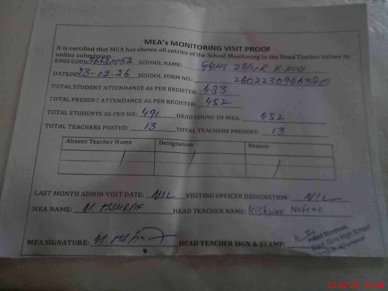 | Attendance Register | Head Teacher | MEA with School | Visit Proof |