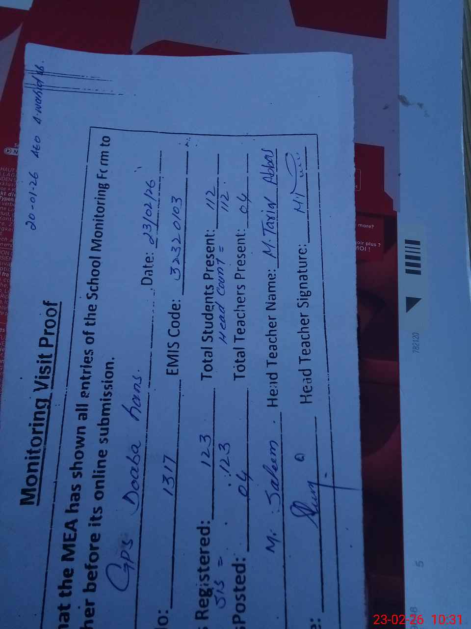 | Attendance Register | Head Teacher | MEA with School | Visit Proof |