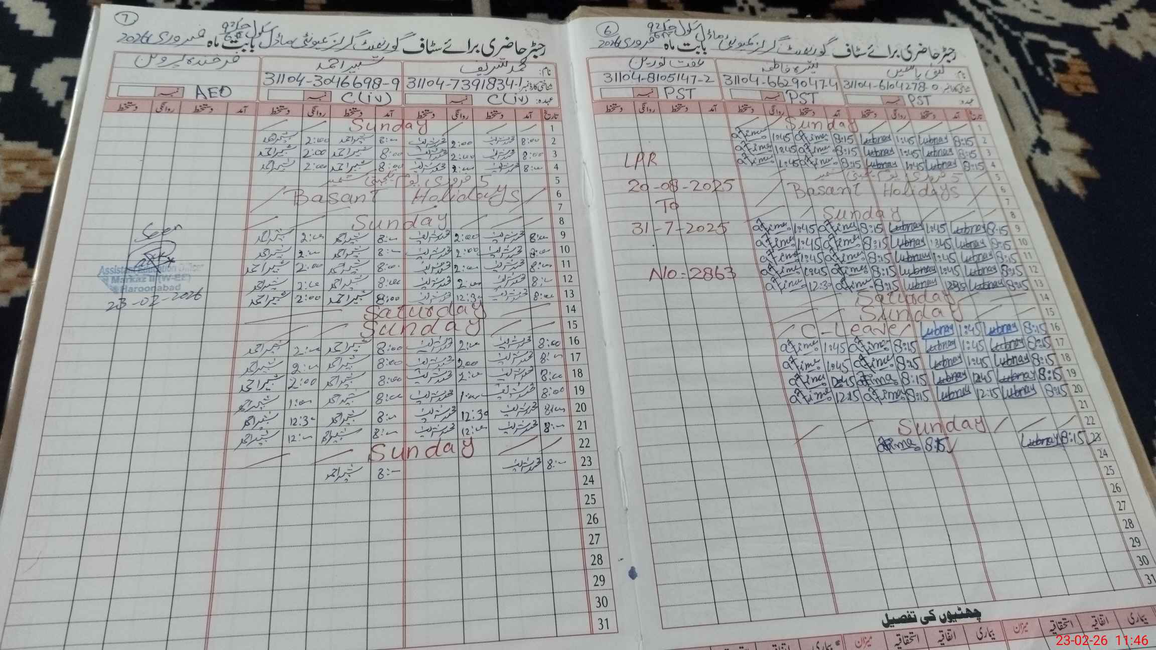 | CNIC | Full Name | Designation | R/C | Absence During Last Calender Month |