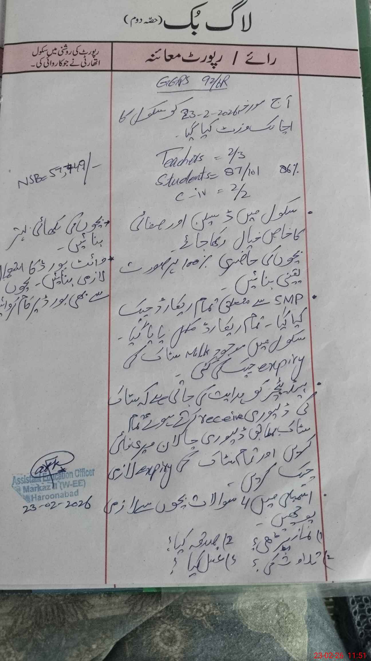 | Certified that this School was Inspected by the Undersigned MEA/DMO Today and the Information Stated Above is as Per Record. | |||||