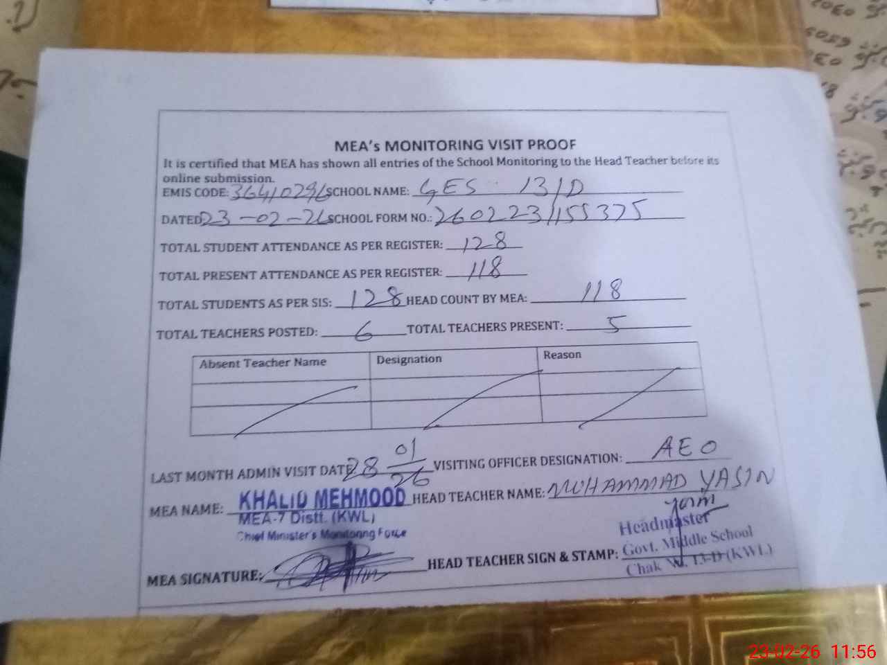 | Attendance Register | Head Teacher | MEA with School | Visit Proof |