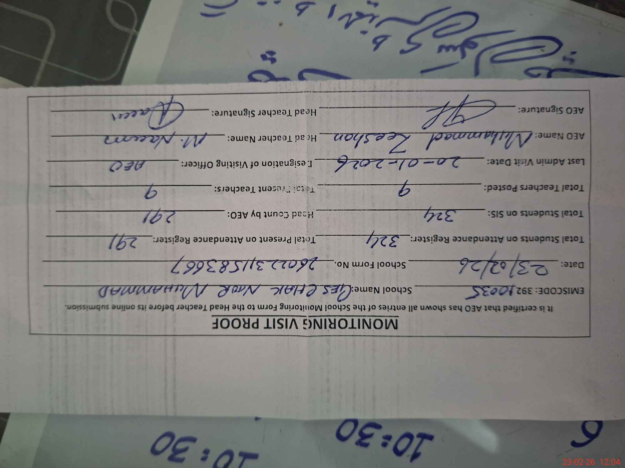 | Attendance Register | Head Teacher | MEA with School | Visit Proof |