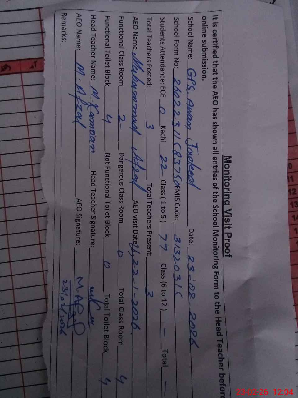 | Attendance Register | Head Teacher | MEA with School | Visit Proof |