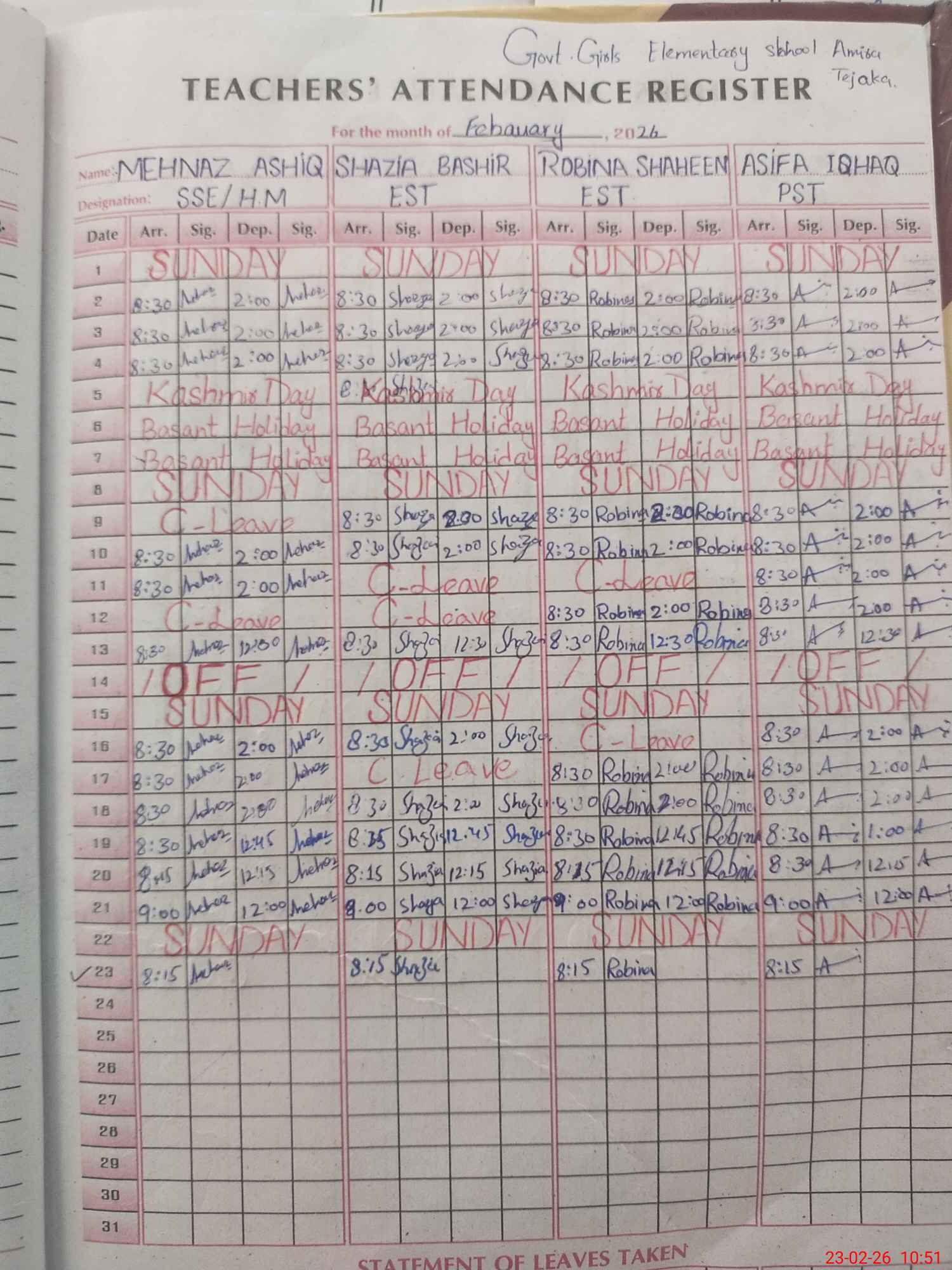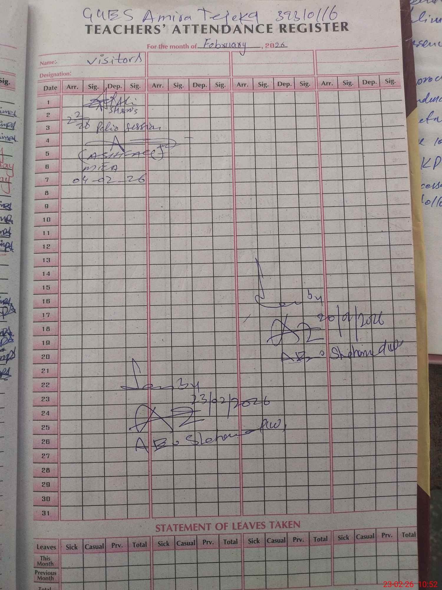 | Attendance Register | Head Teacher | MEA with School | Visit Proof |