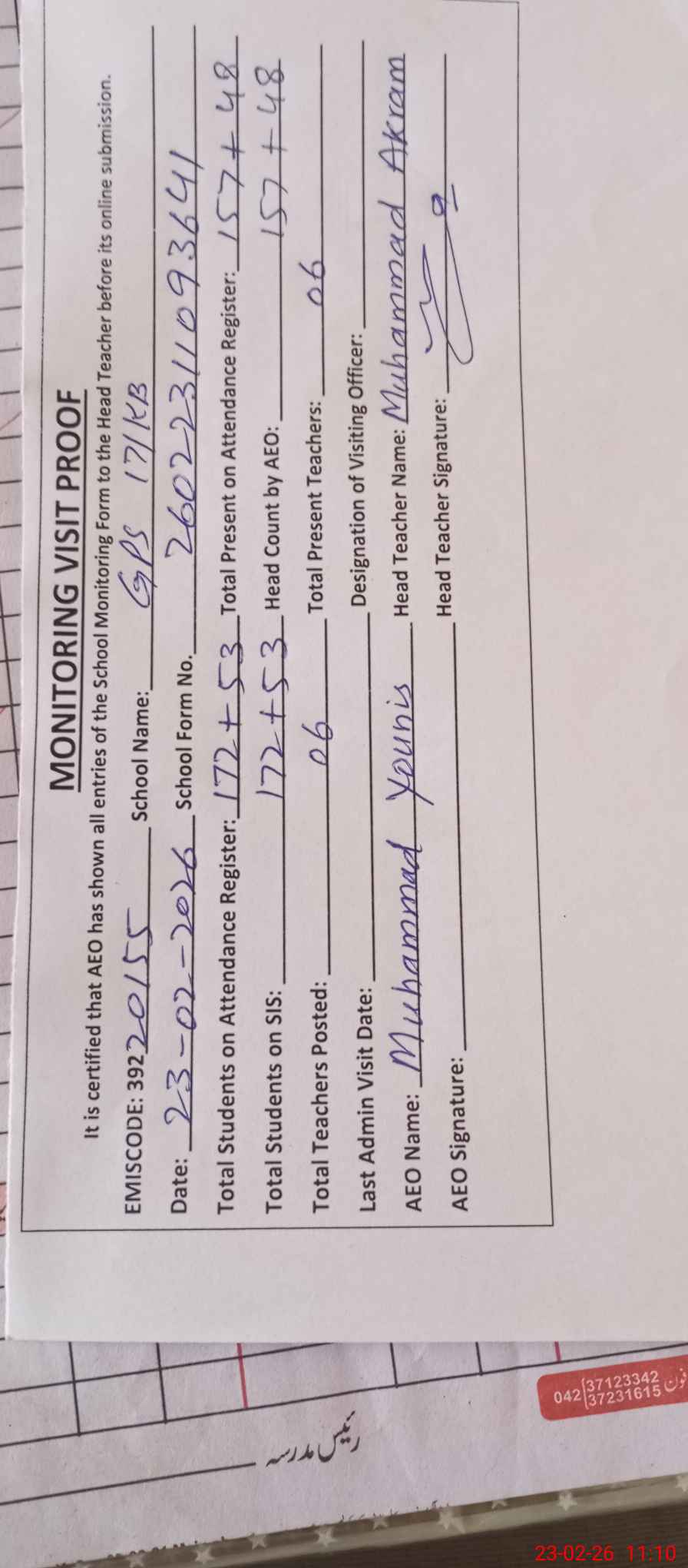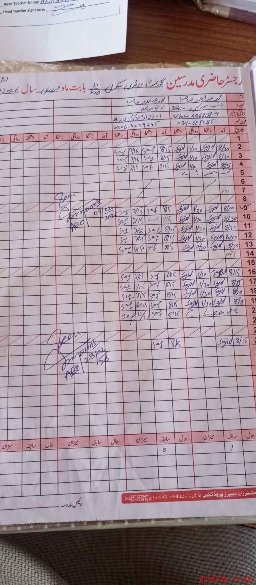 | Name: MU**** AK**** Designation: (School Headmaster's/Headmistress's) PST Phone/Cell Number: 03**** |