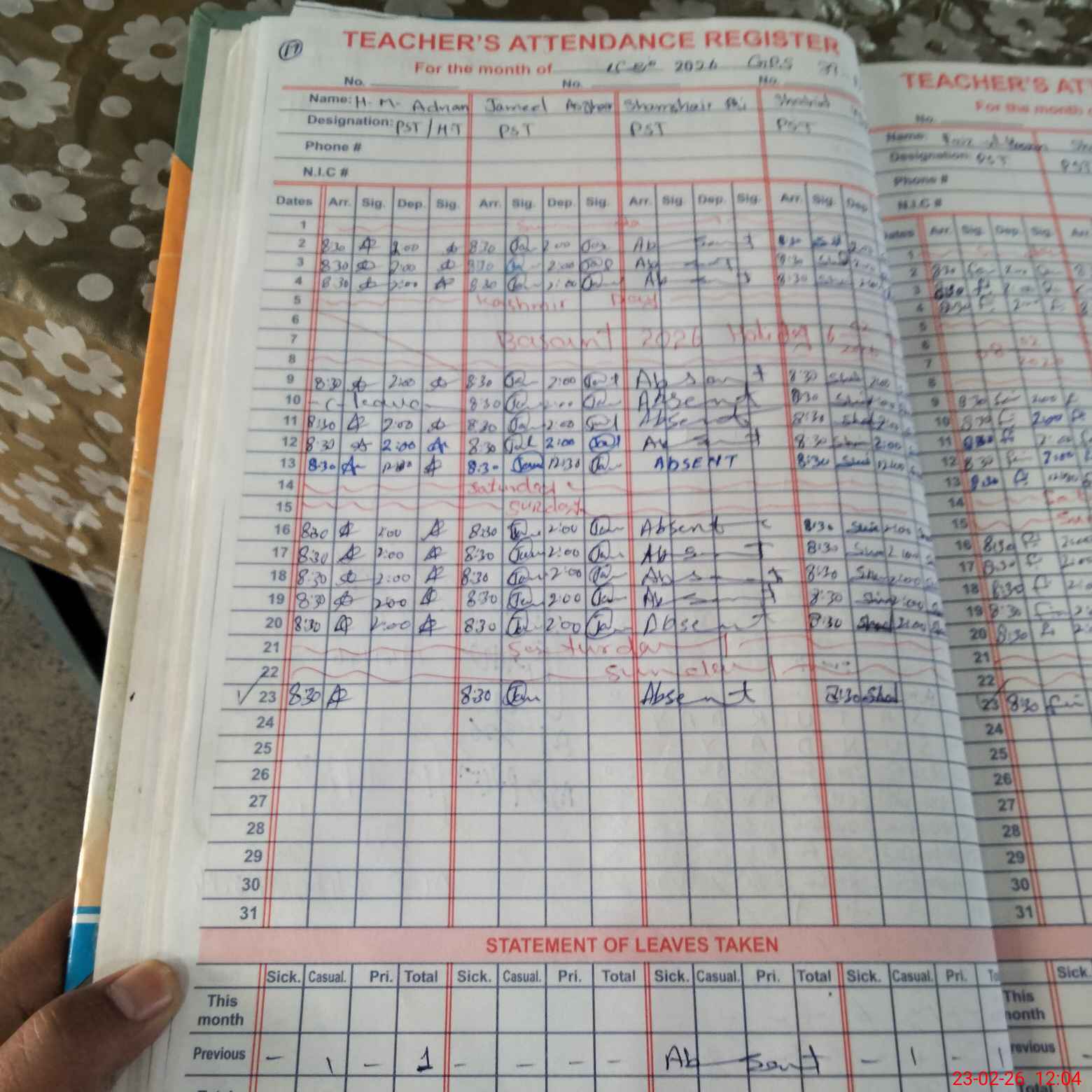 | 35**** | Sh**** Al**** | PST Science/Maths | Regular | 0 | 0 | 0 | 0 | 0 | 0 | 0 | 0 | 0 | Absent (Un-Authorized) |