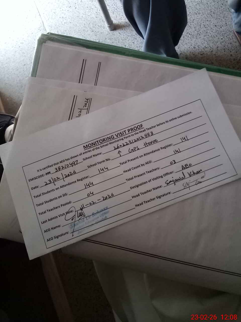 | Attendance Register | Head Teacher | MEA with School | Visit Proof |