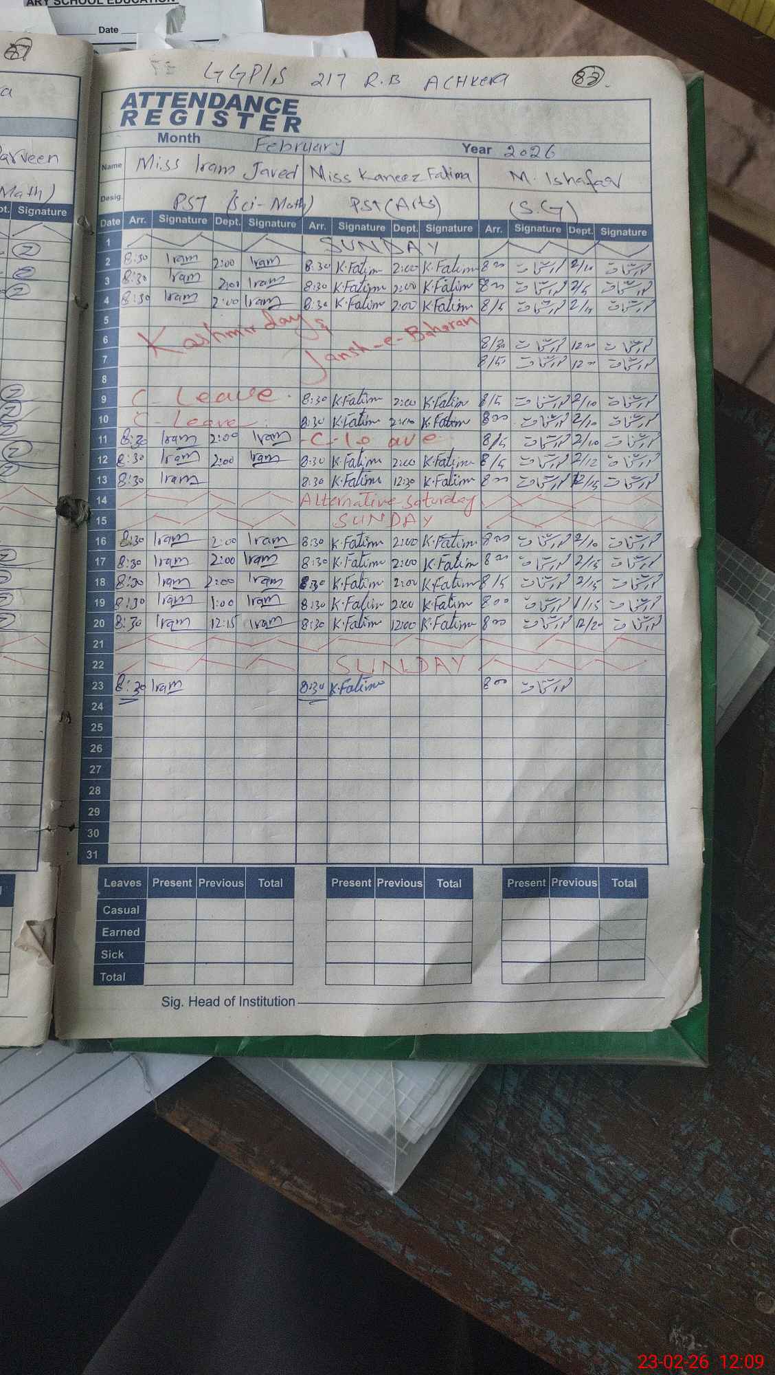 | No. of Students Present - Female | 0 | 0 | 50 | 46 | 45 | 45 | 28 | 269 | ||||||||