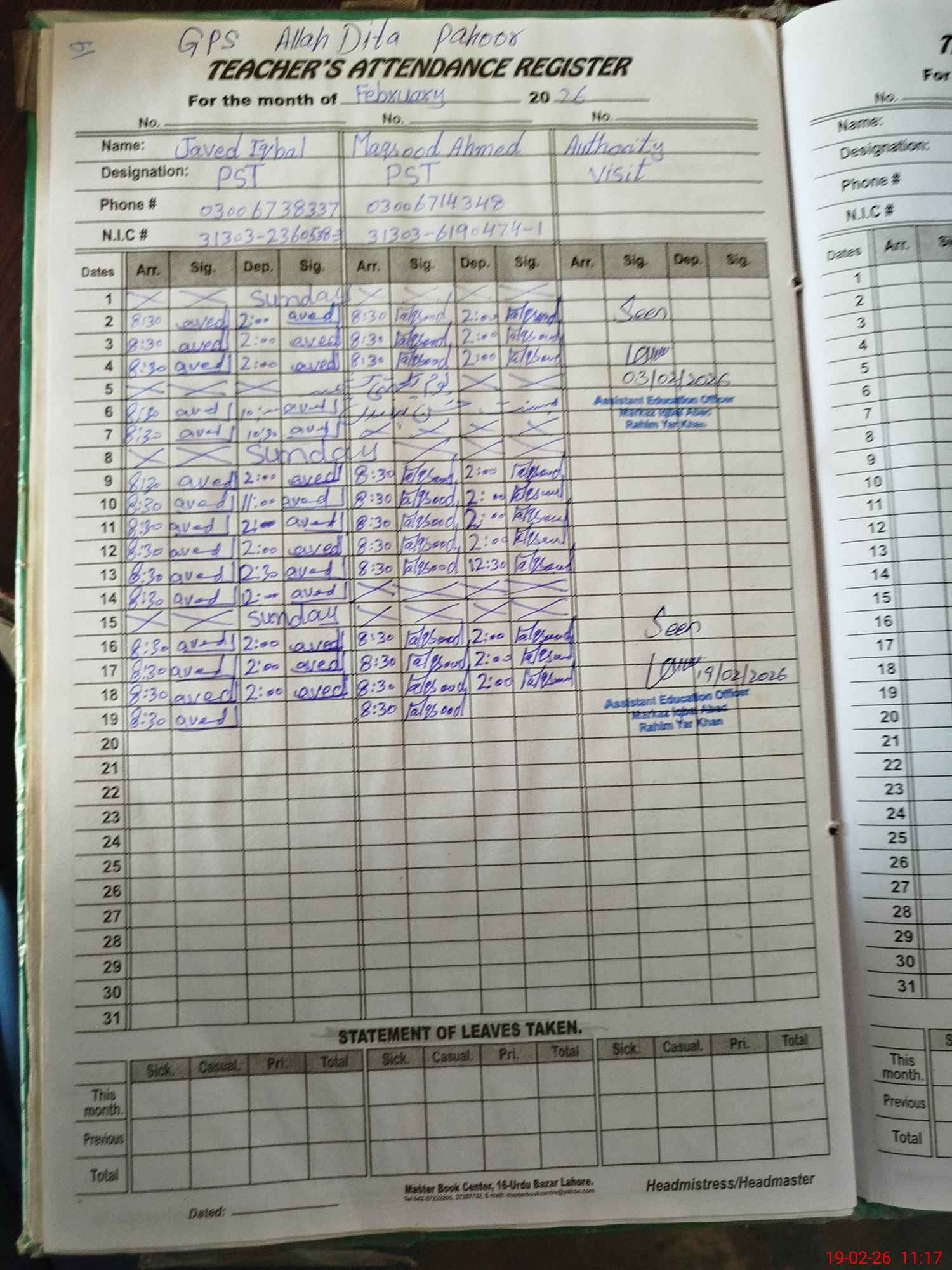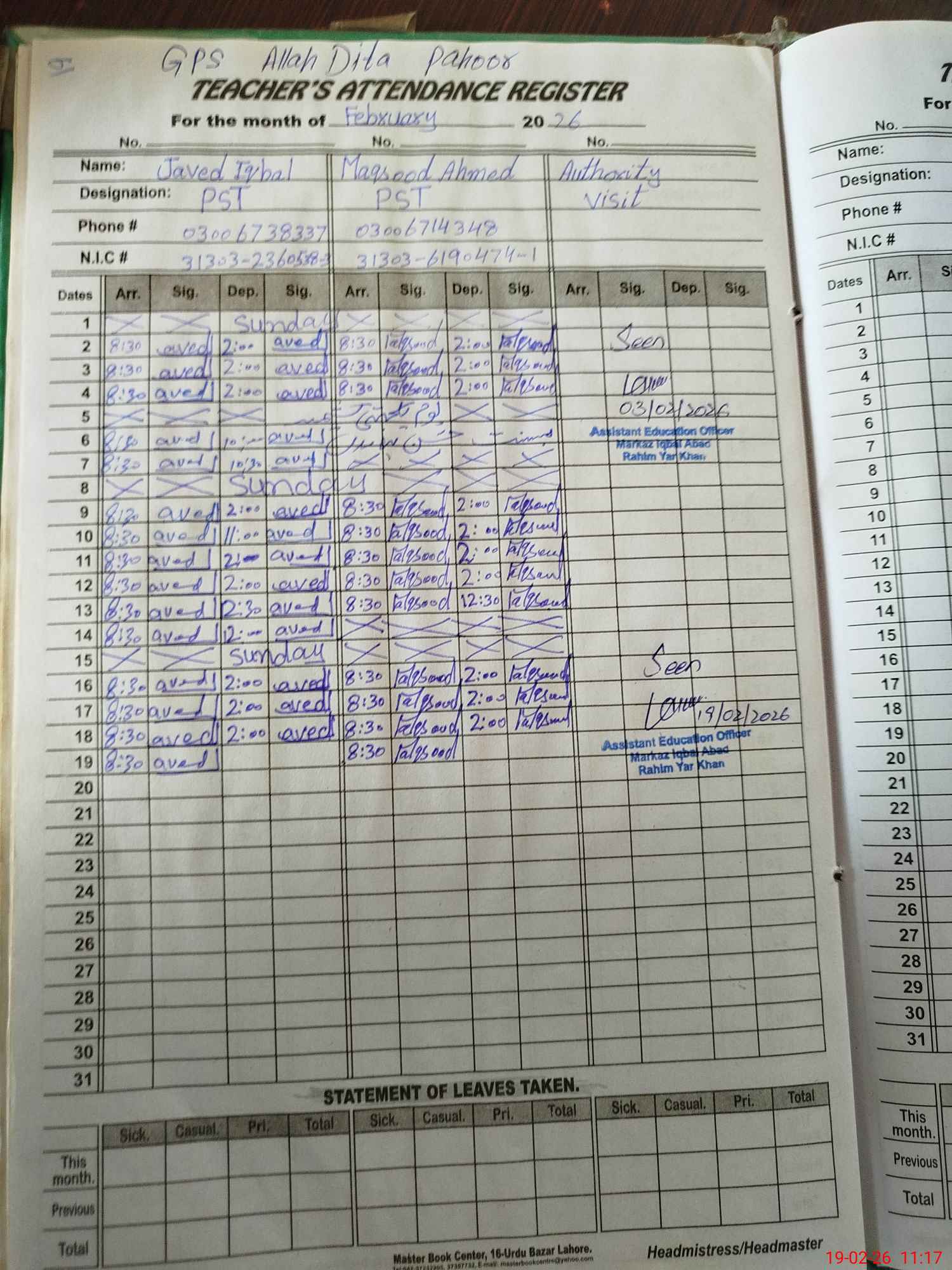 | Name: JA**** IQ**** Designation: (School Headmaster's/Headmistress's) PST/PTC/JV Phone/Cell Number: 03**** |