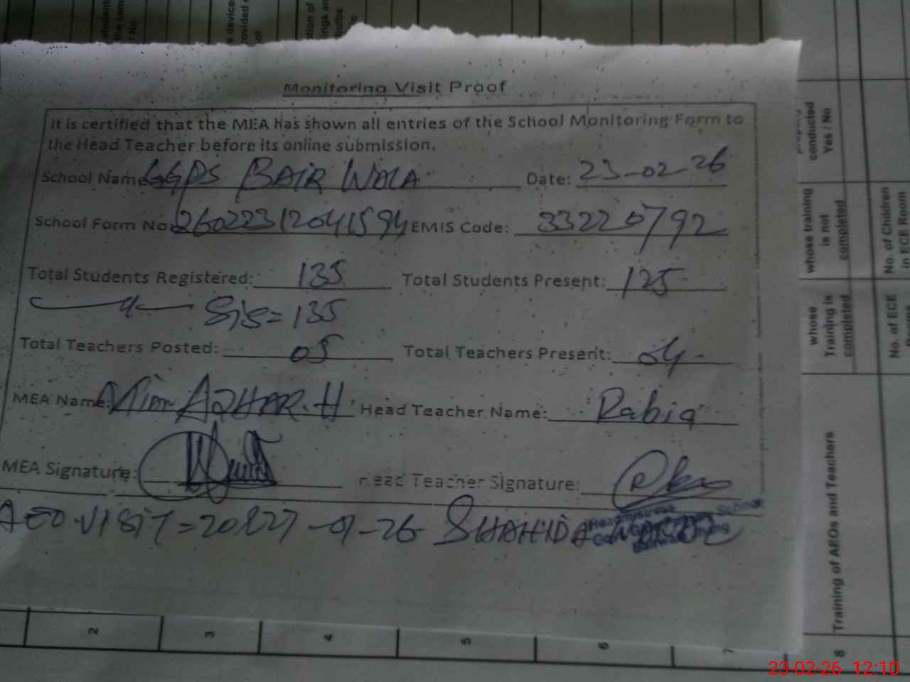 | Attendance Register | Head Teacher | MEA with School | Visit Proof |
