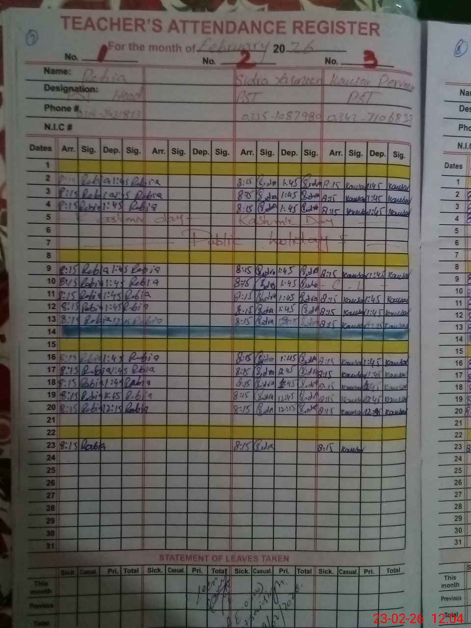 | CNIC | Full Name | Designation | R/C | Absence During Last Calender Month |