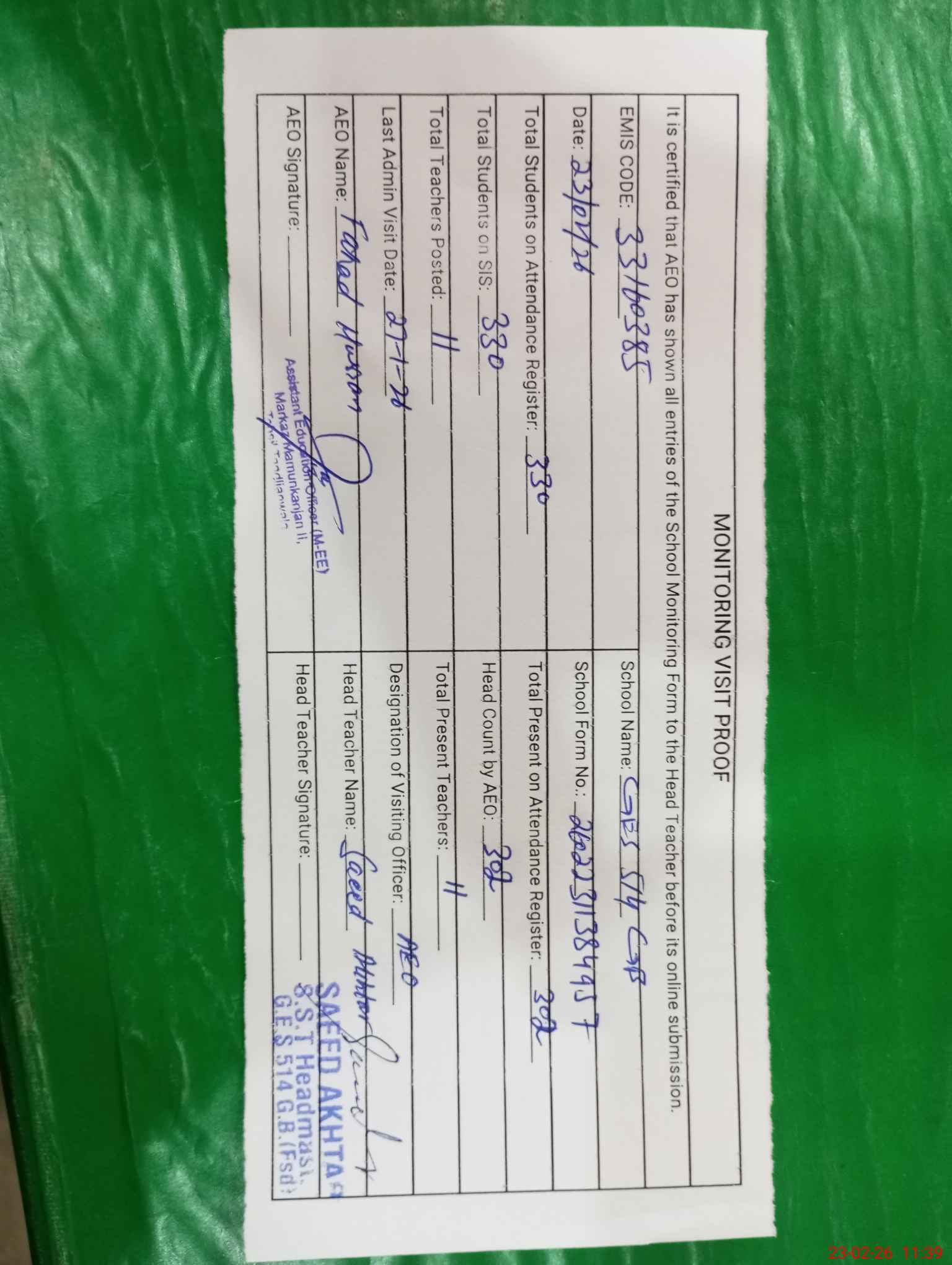 | Attendance Register | Head Teacher | MEA with School | Visit Proof |