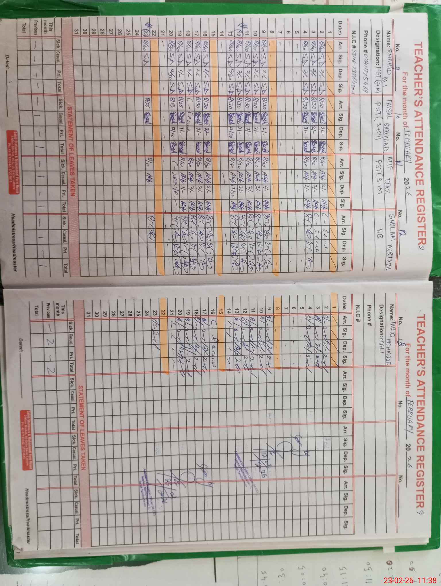 | CNIC | Full Name | Designation | R/C | Absence During Last Calender Month |