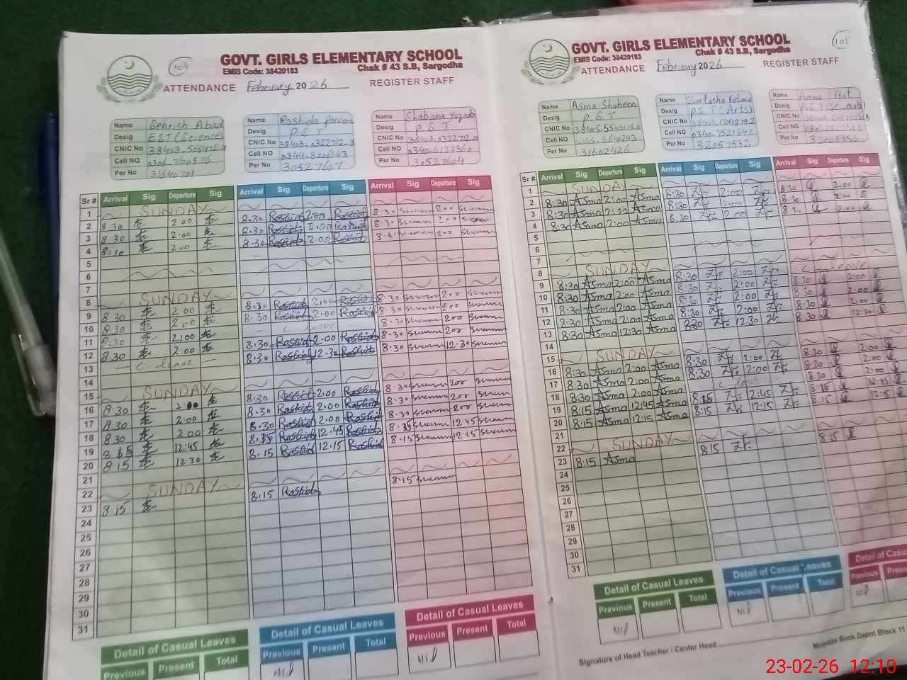 | CNIC | Full Name | Designation | R/C | Absence During Last Calender Month |
