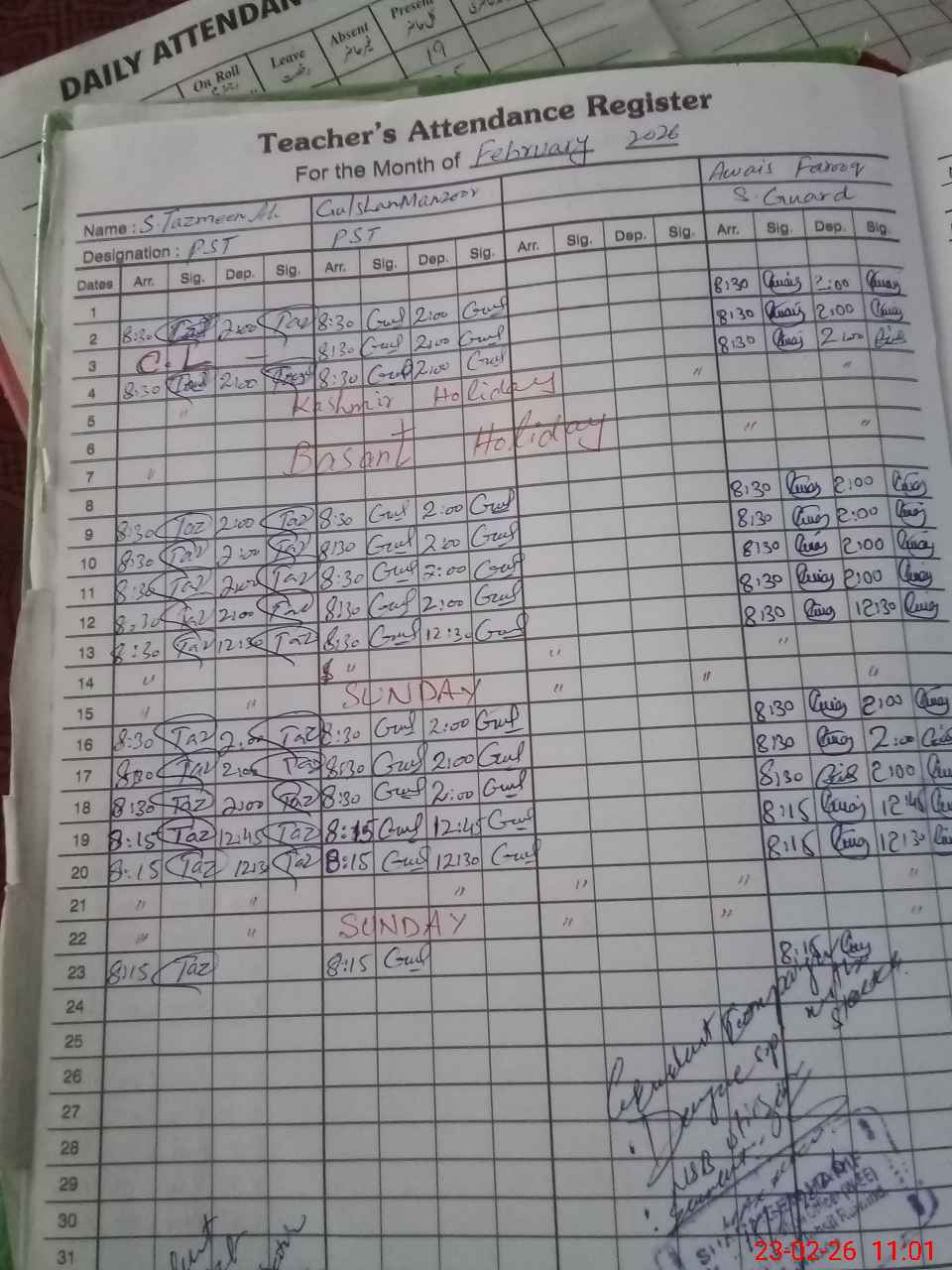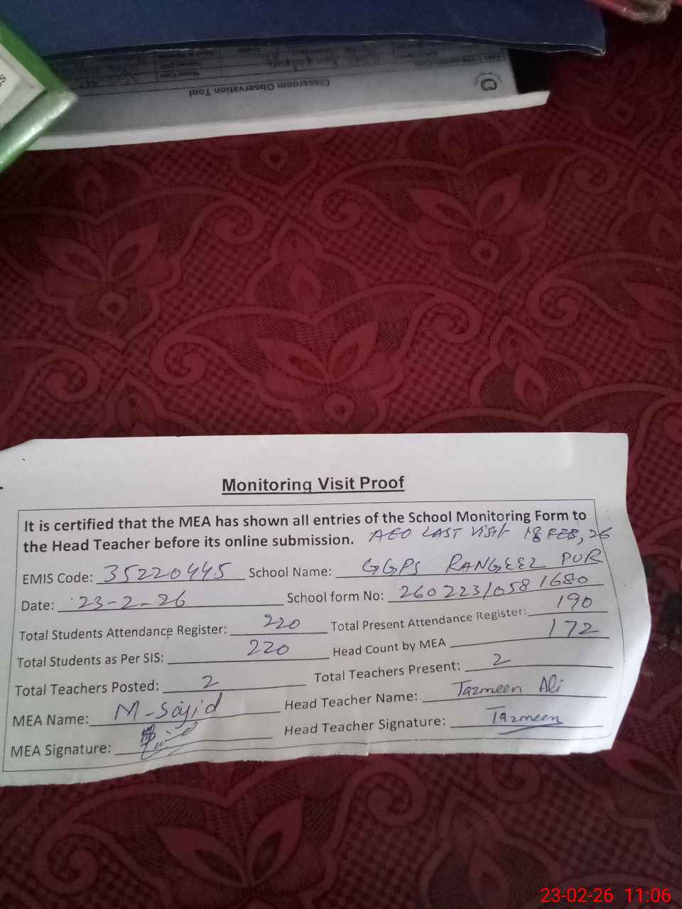 | Remarks (Use Separate Page if Required): Boundary wall construction work from back side has stopped due to lack of fund so no boundary wall at back side two toilets were without water container and one was locked Water is not available because of load shedding of electricity 18 students difference in Roznamcha and head count One classroom apparently seems dangerous NSB record is not shown to me FTF account is non functional 35230445 | |||||