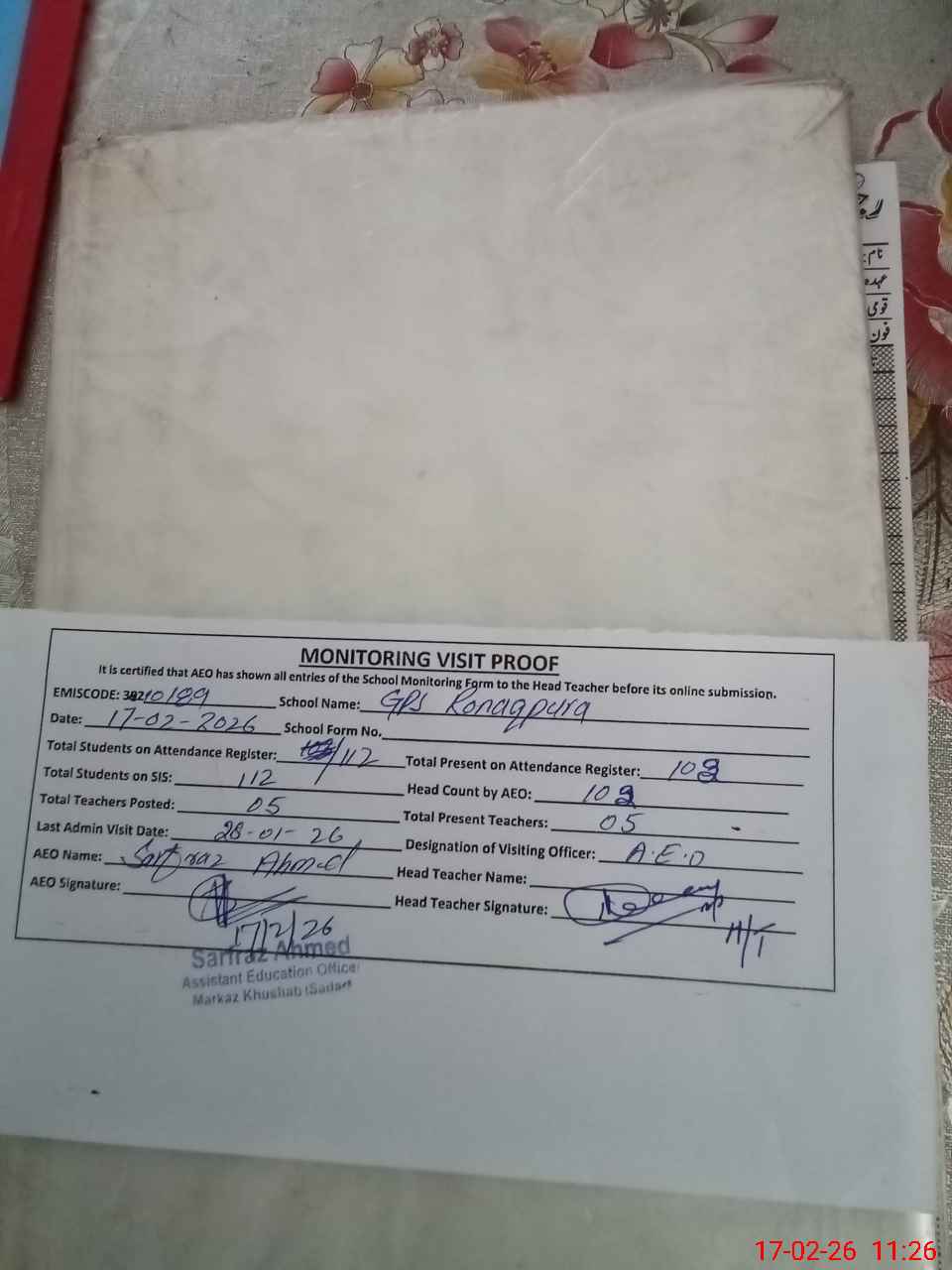 | Attendance Register | Head Teacher | MEA with School | Visit Proof |