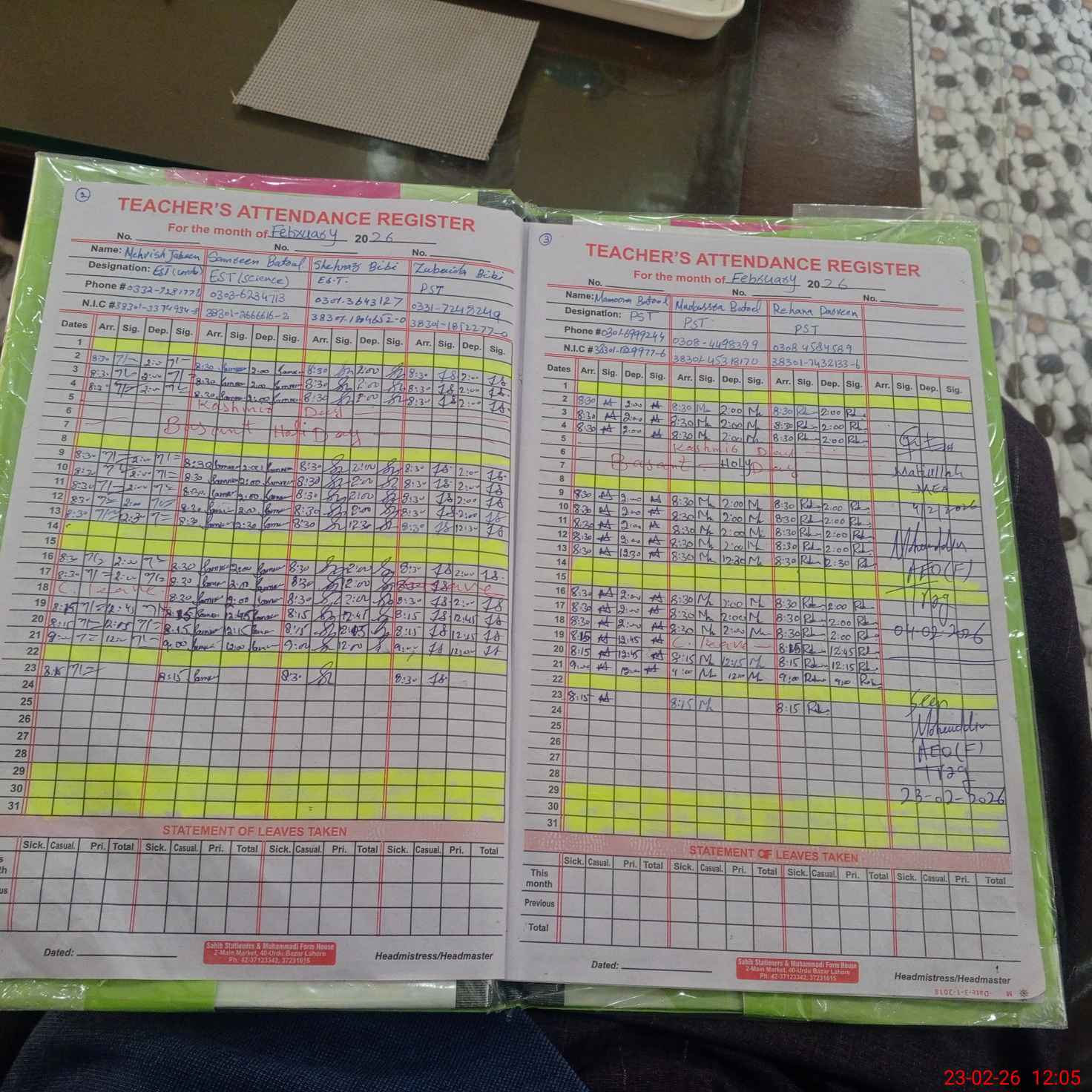 | CNIC | Full Name | Designation | R/C | Absence During Last Calender Month |