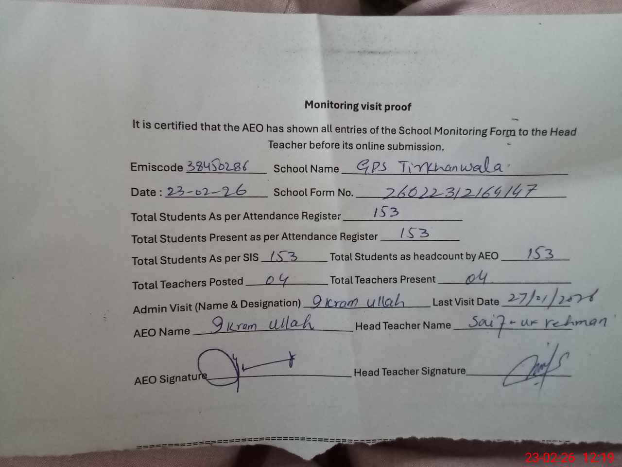 | EMIS Code: 38450286 | Name of School: GPS TIRKHAN WALA | |||