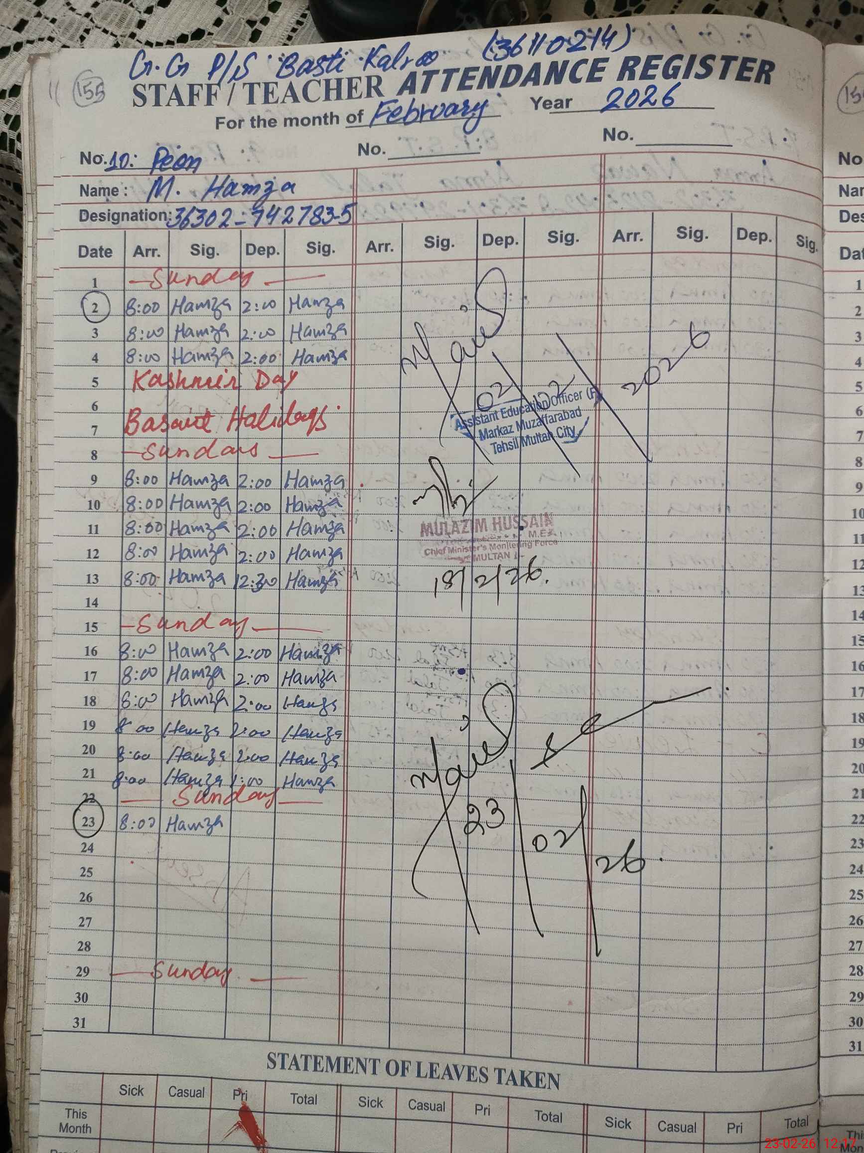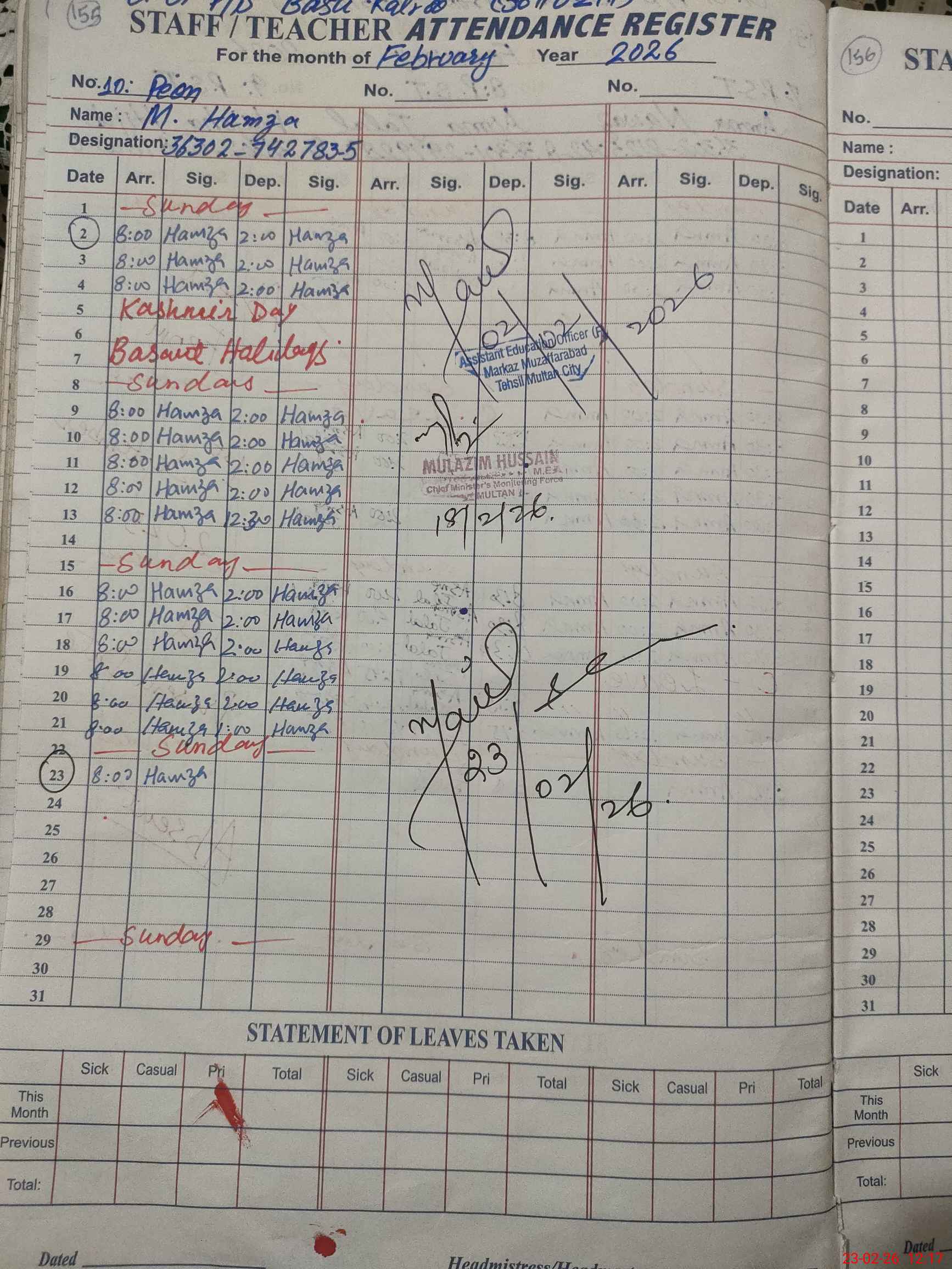 | 36**** | Wa**** Hi**** | PST Arts | Regular | 0 | 0 | 0 | 0 | 0 | 0 | 0 | 0 | 0 | Absent (Un-Authorized) |