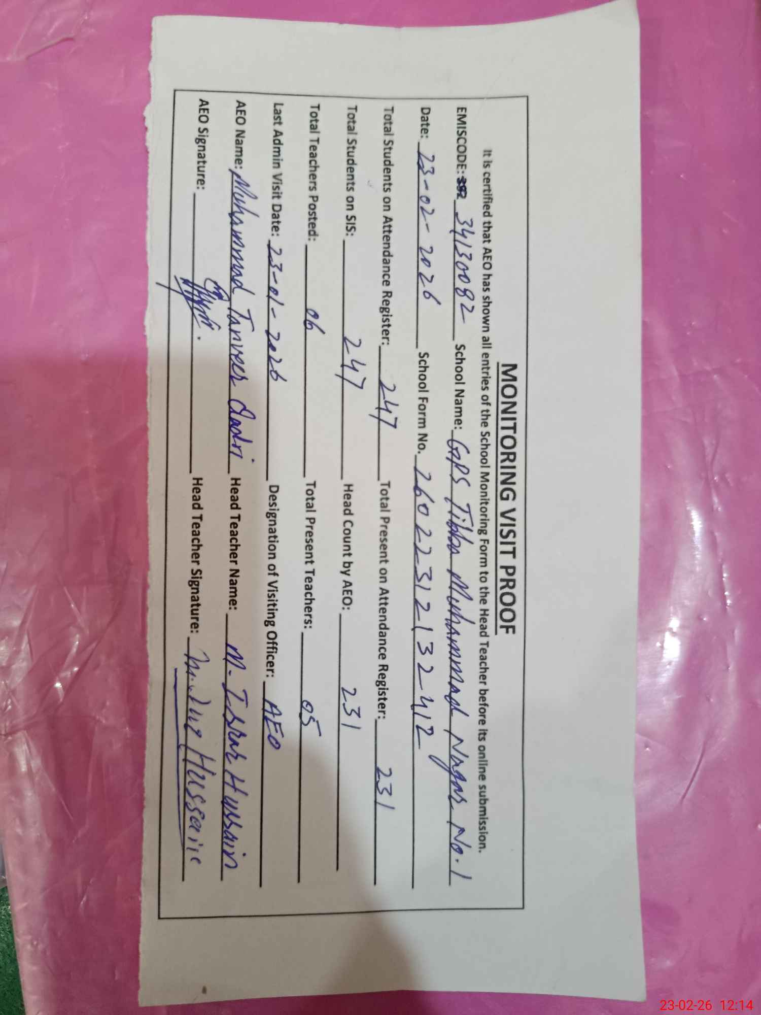 | Certified that this School was Inspected by the Undersigned MEA/DMO Today and the Information Stated Above is as Per Record. | |||||