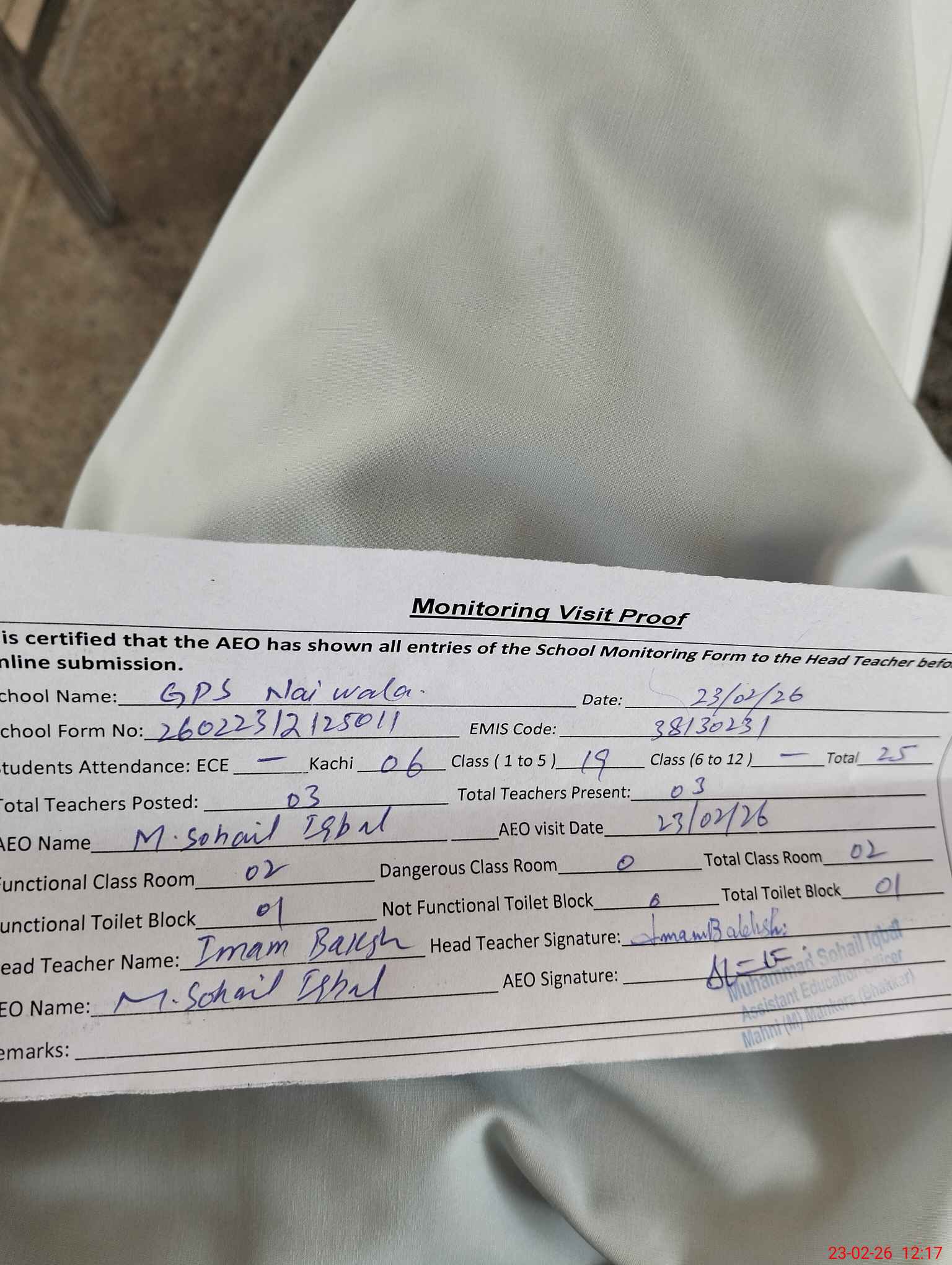 | EMIS Code: 38130231 | Name of School: GPS NAI WALA | |||