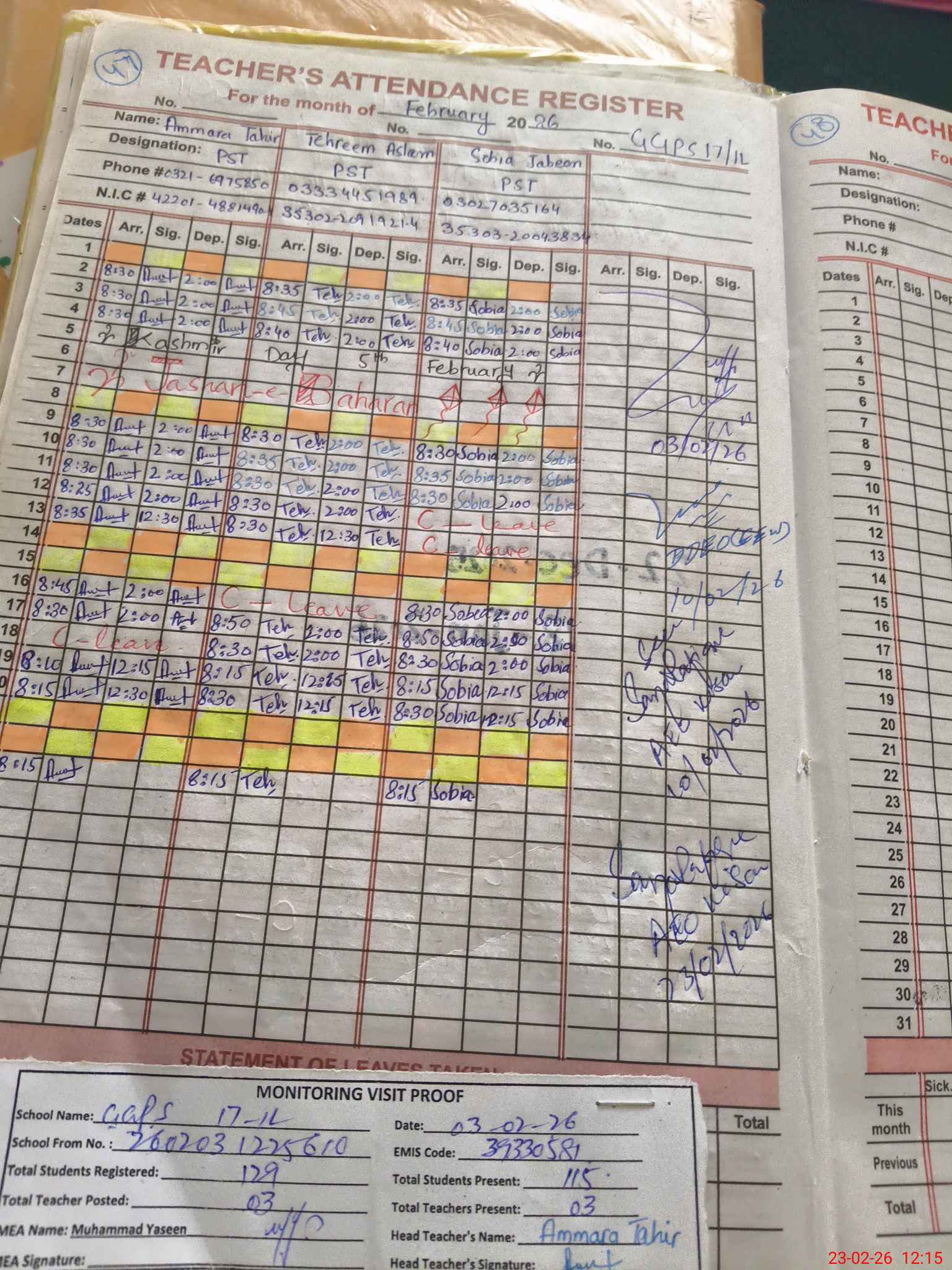 | Attendance Register | Head Teacher | MEA with School | Visit Proof |