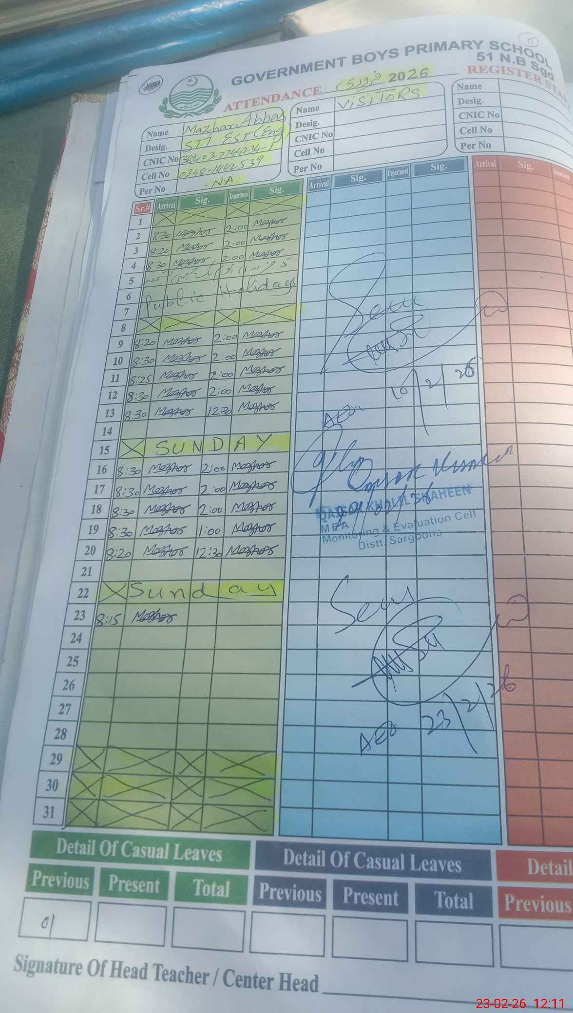 | Attendance Register | Head Teacher | MEA with School | Visit Proof |
