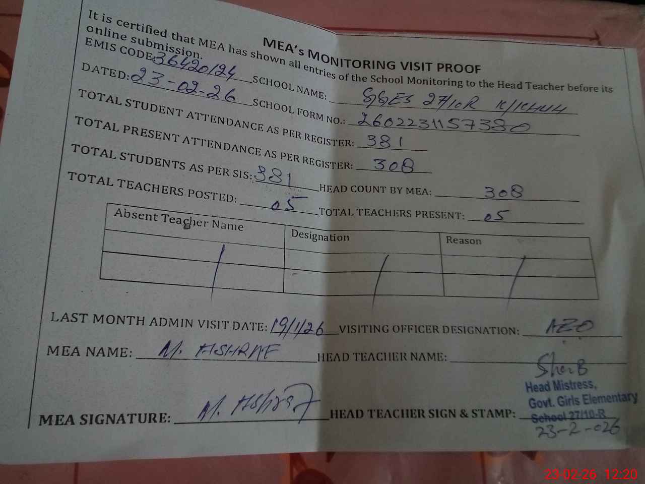 | Attendance Register | Head Teacher | MEA with School | Visit Proof |