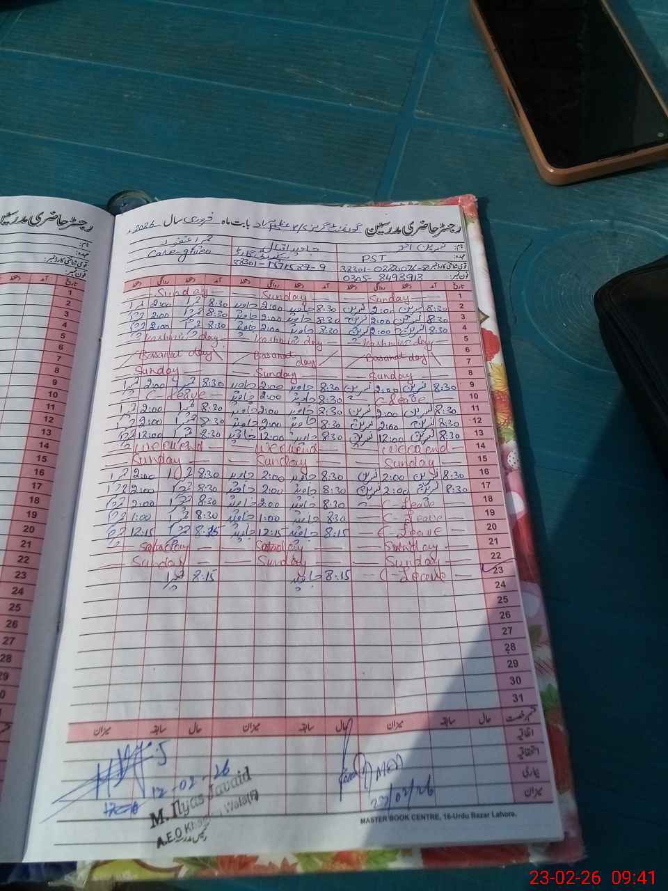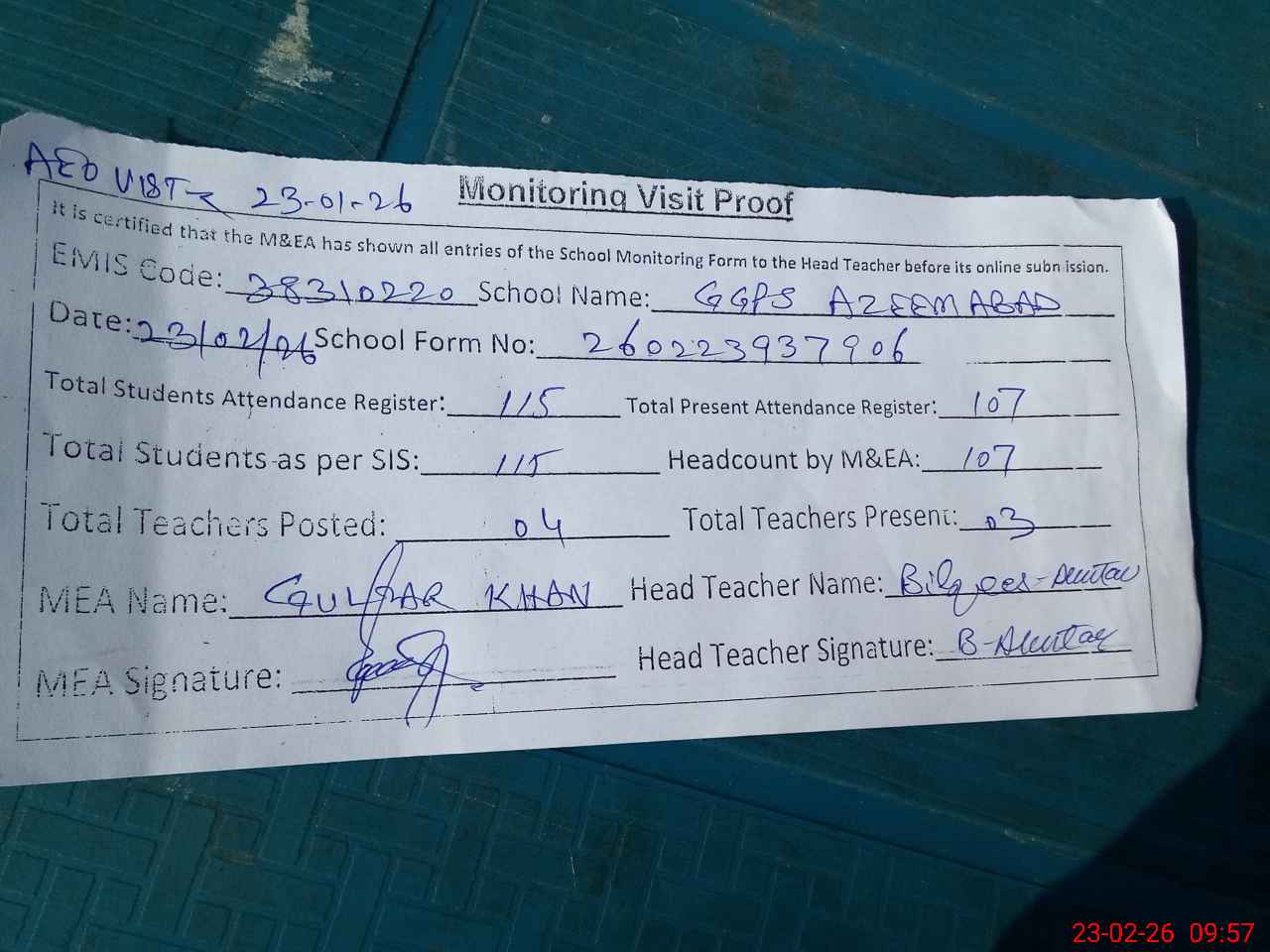 | Attendance Register | Head Teacher | MEA with School | Visit Proof |
