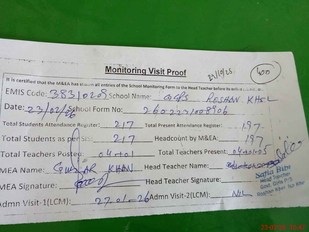 | Attendance Register | Head Teacher | MEA with School | Visit Proof |