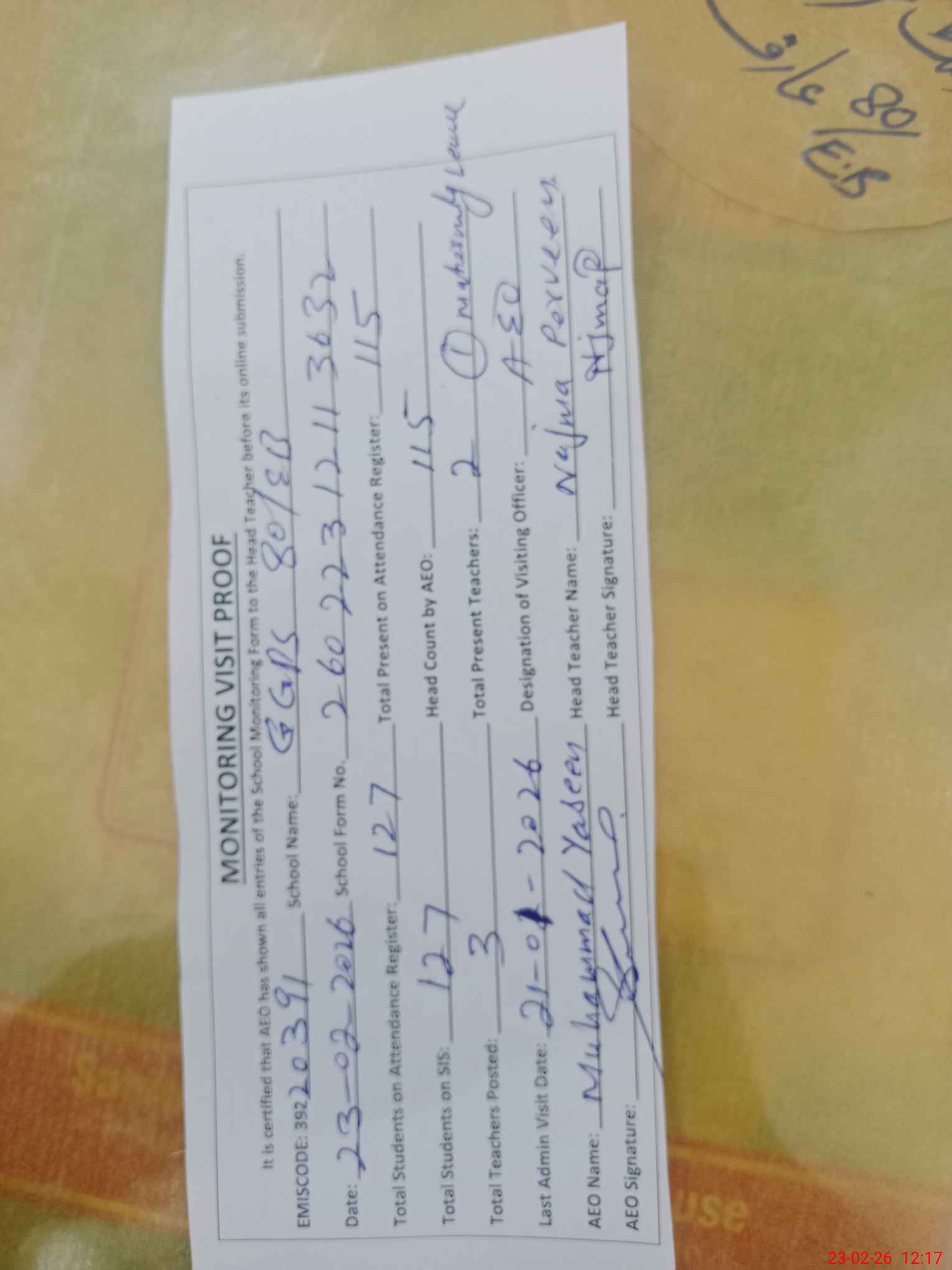 | Attendance Register | Head Teacher | MEA with School | Visit Proof |