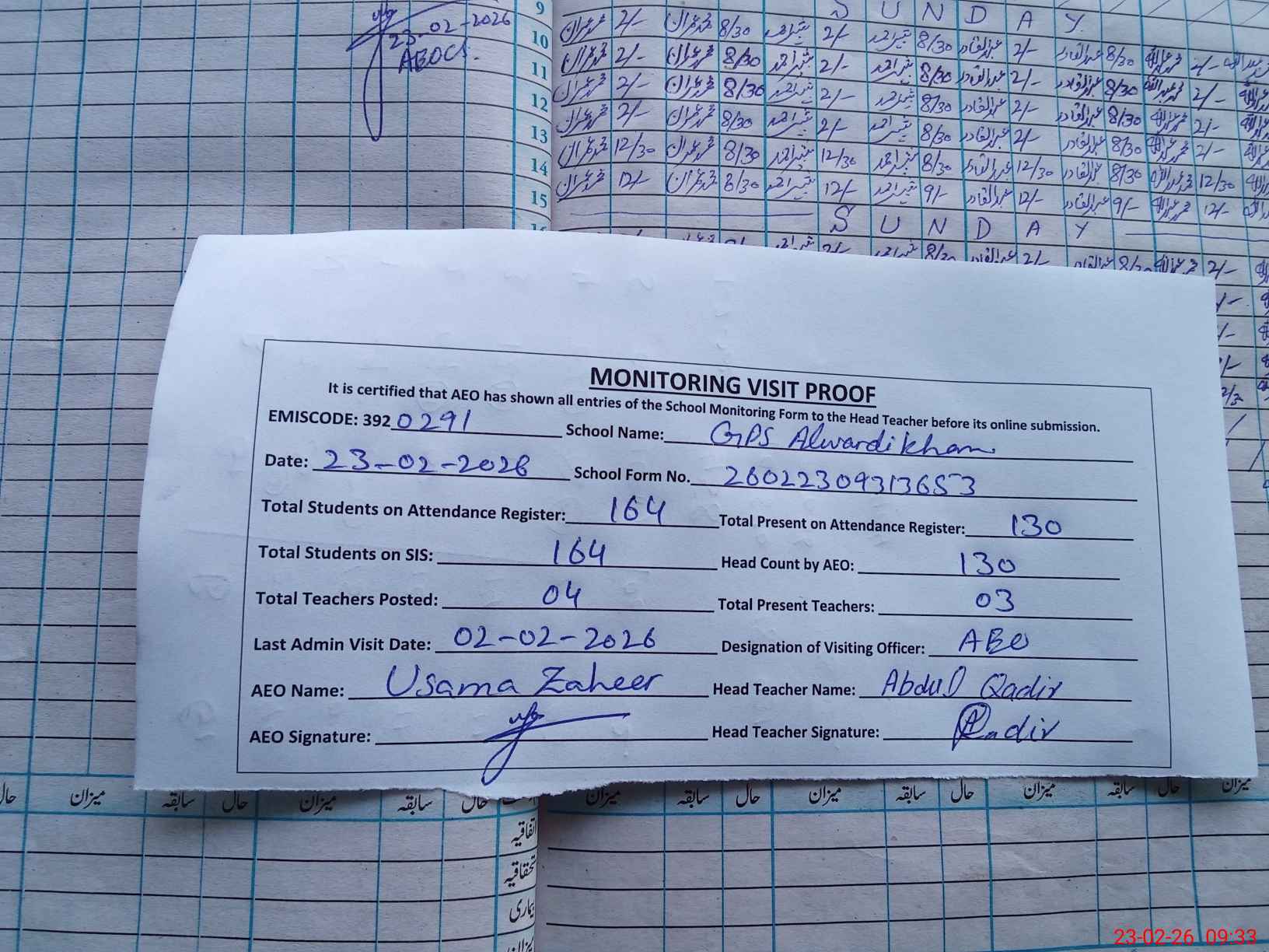 | Attendance Register | Head Teacher | MEA with School | Visit Proof |