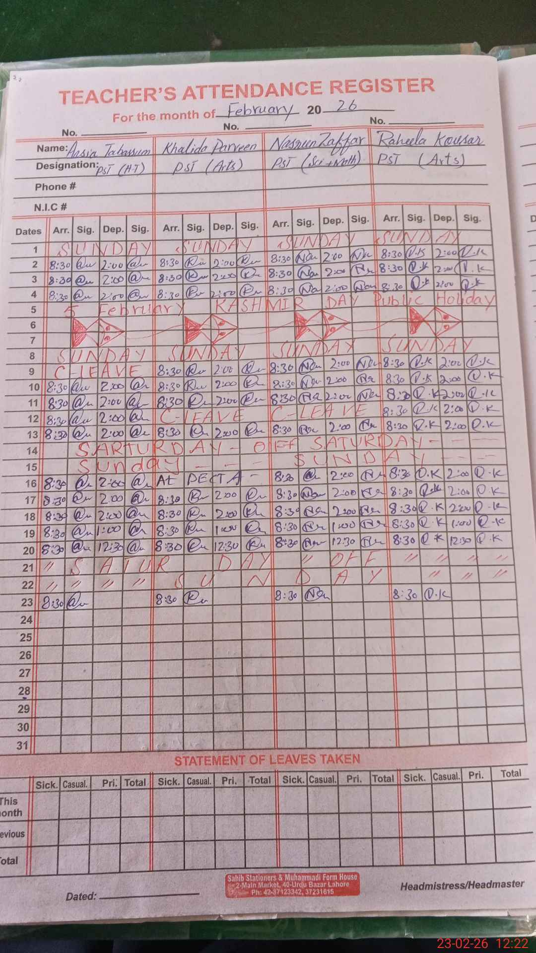 | CNIC | Full Name | Designation | R/C | Absence During Last Calender Month |