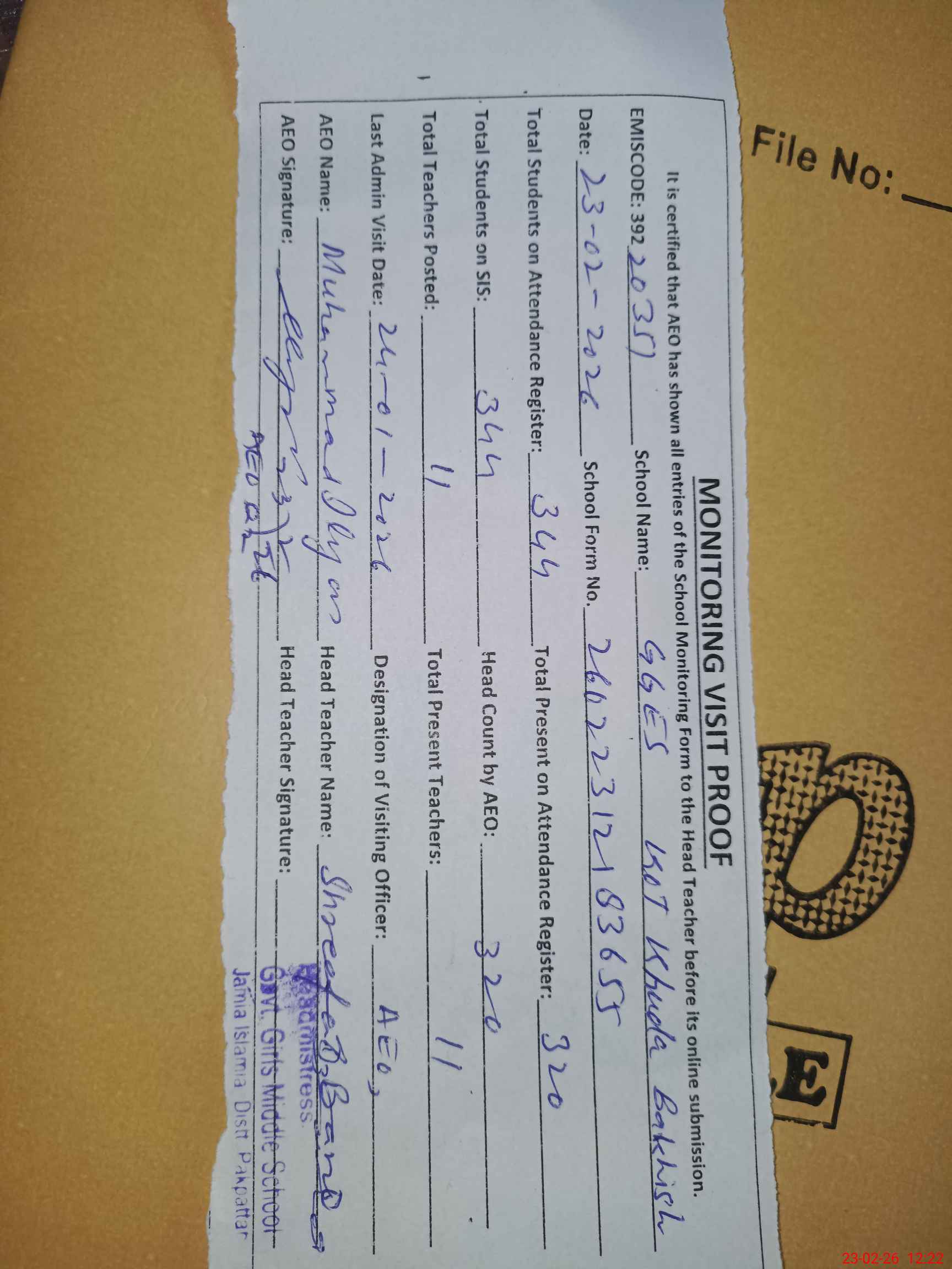 | Attendance Register | Head Teacher | MEA with School | Visit Proof |
