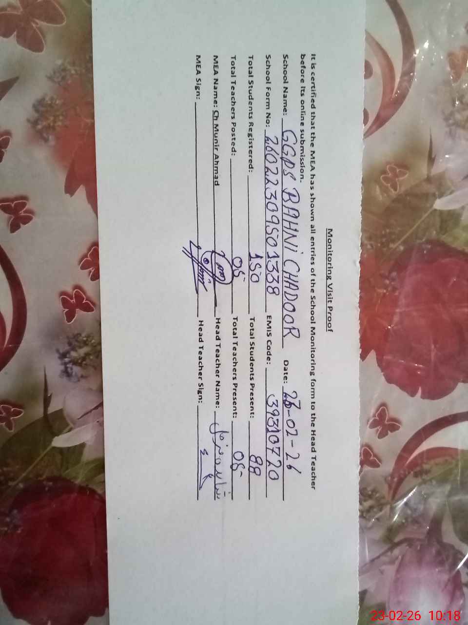 | EMIS Code: 39310720 | Name of School: GGPS BAHNI CHANDOOR | |||
