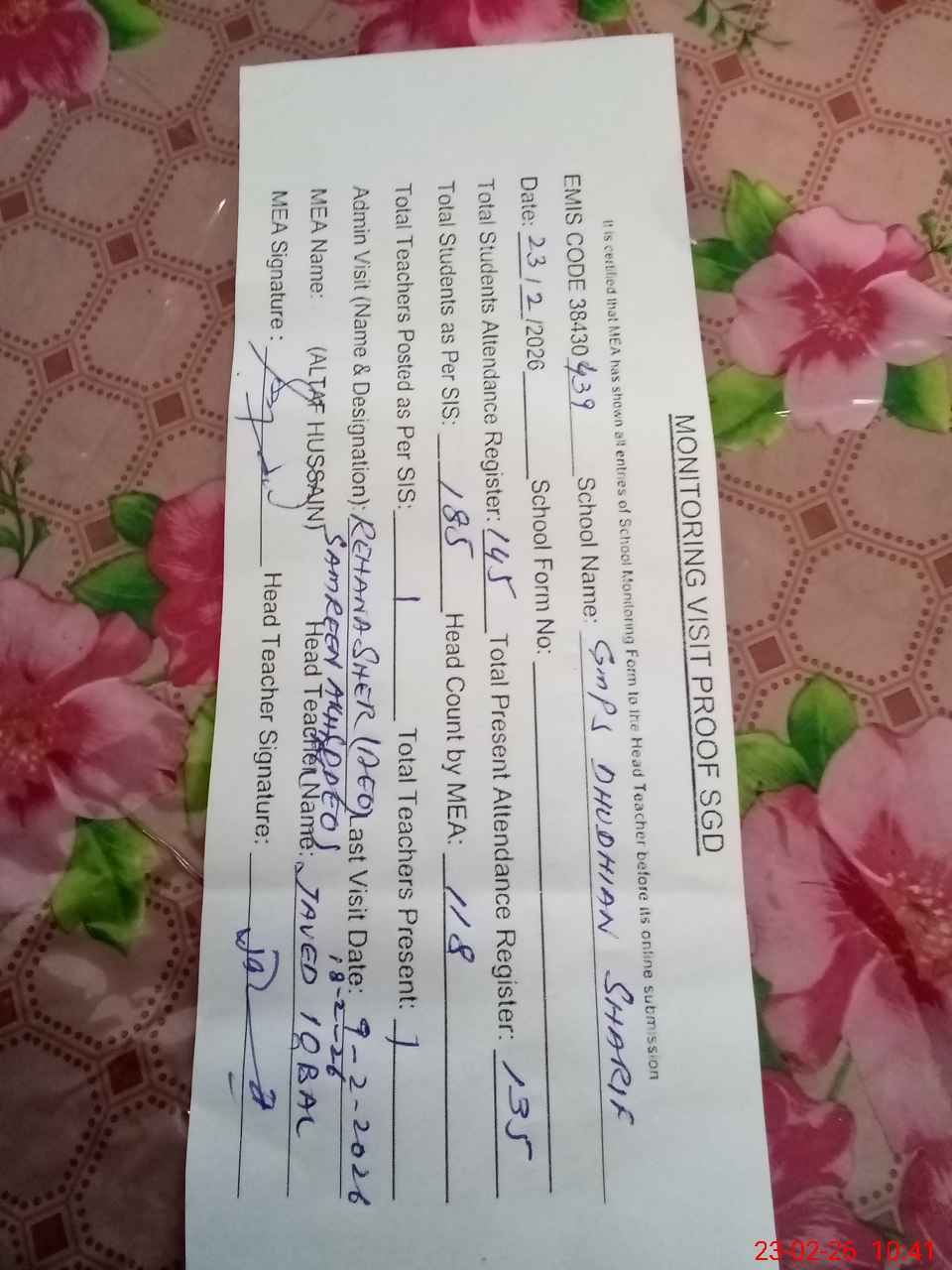 | EMIS Code: 38430439 | Name of School: GMPS DHUDIAN SHARIF | |||