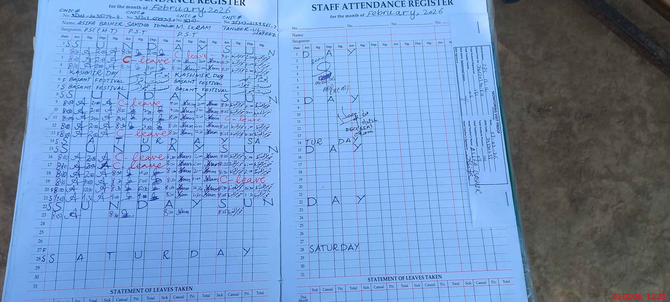 | Attendance Register | Head Teacher | MEA with School | Visit Proof |