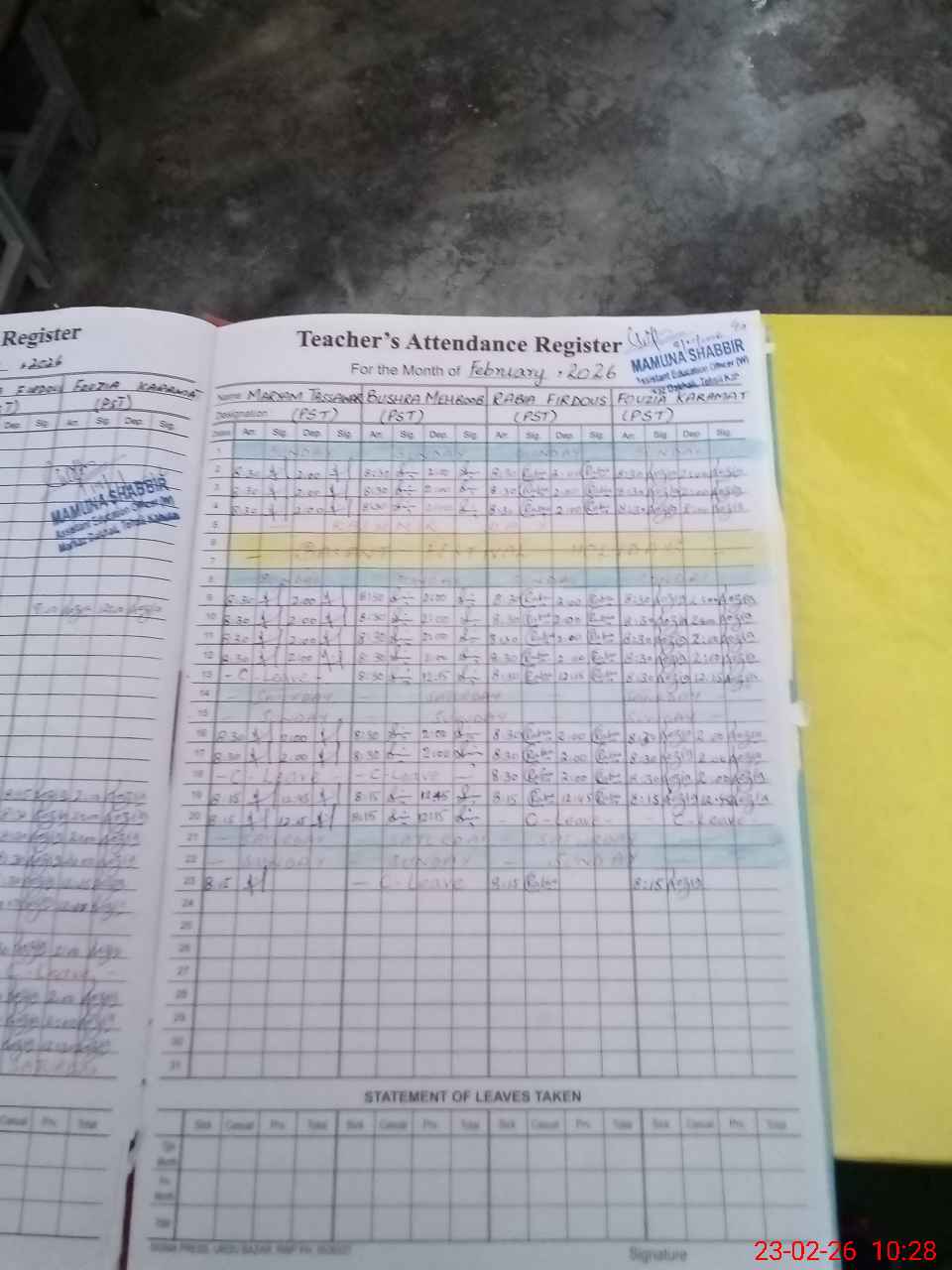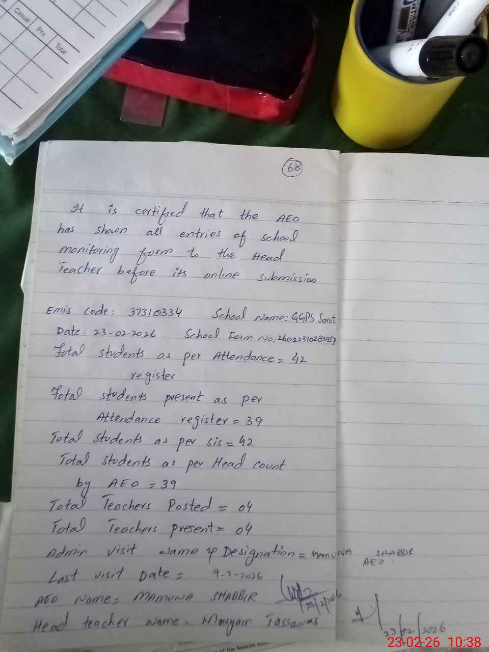 | Attendance Register | Head Teacher | MEA with School | Visit Proof |