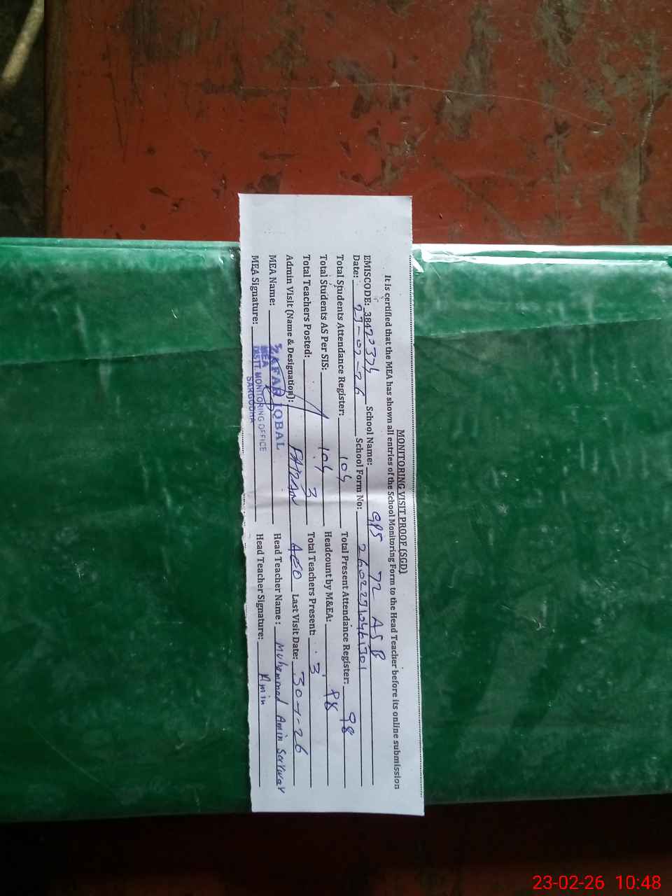 | Attendance Register | Head Teacher | MEA with School | Visit Proof |