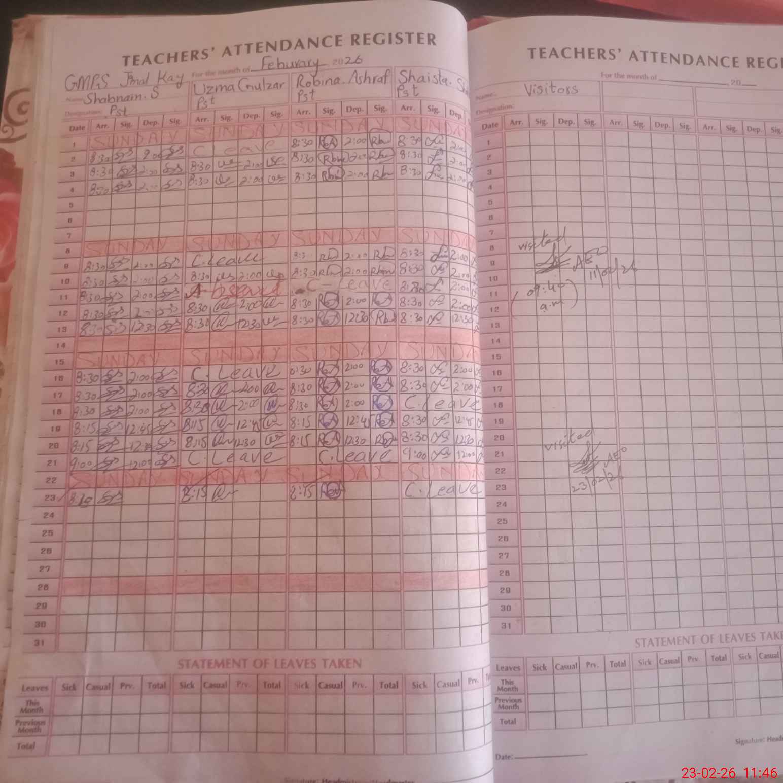 | Attendance Register | Head Teacher | MEA with School | Visit Proof |