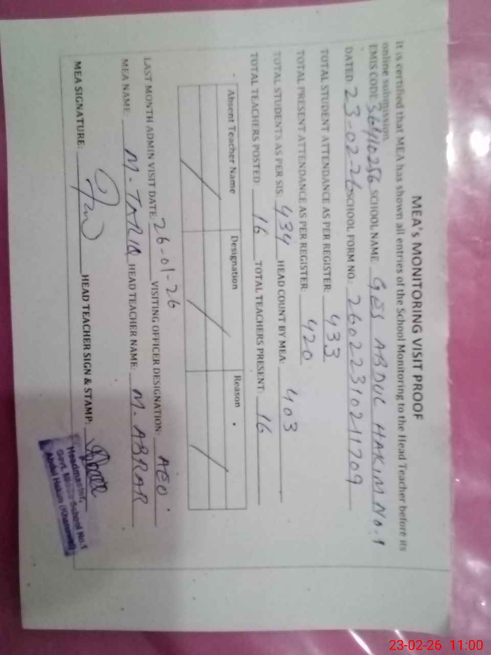 | Attendance Register | Head Teacher | MEA with School | Visit Proof |