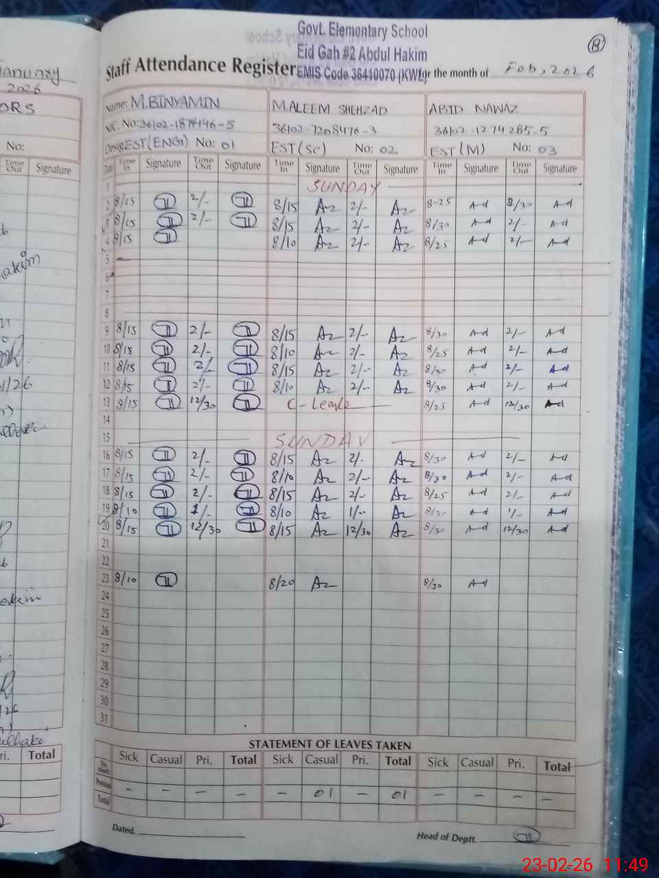 | CNIC | Full Name | Designation | R/C | Absence During Last Calender Month |