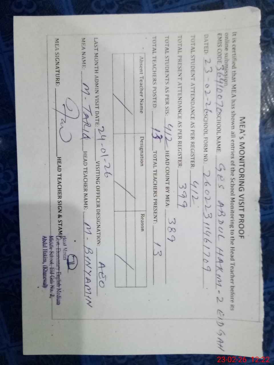 | Attendance Register | Head Teacher | MEA with School | Visit Proof |