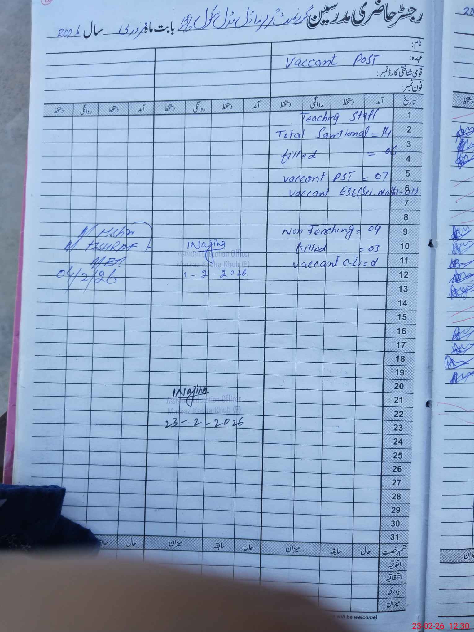 | Attendance Register | Head Teacher | MEA with School | Visit Proof |